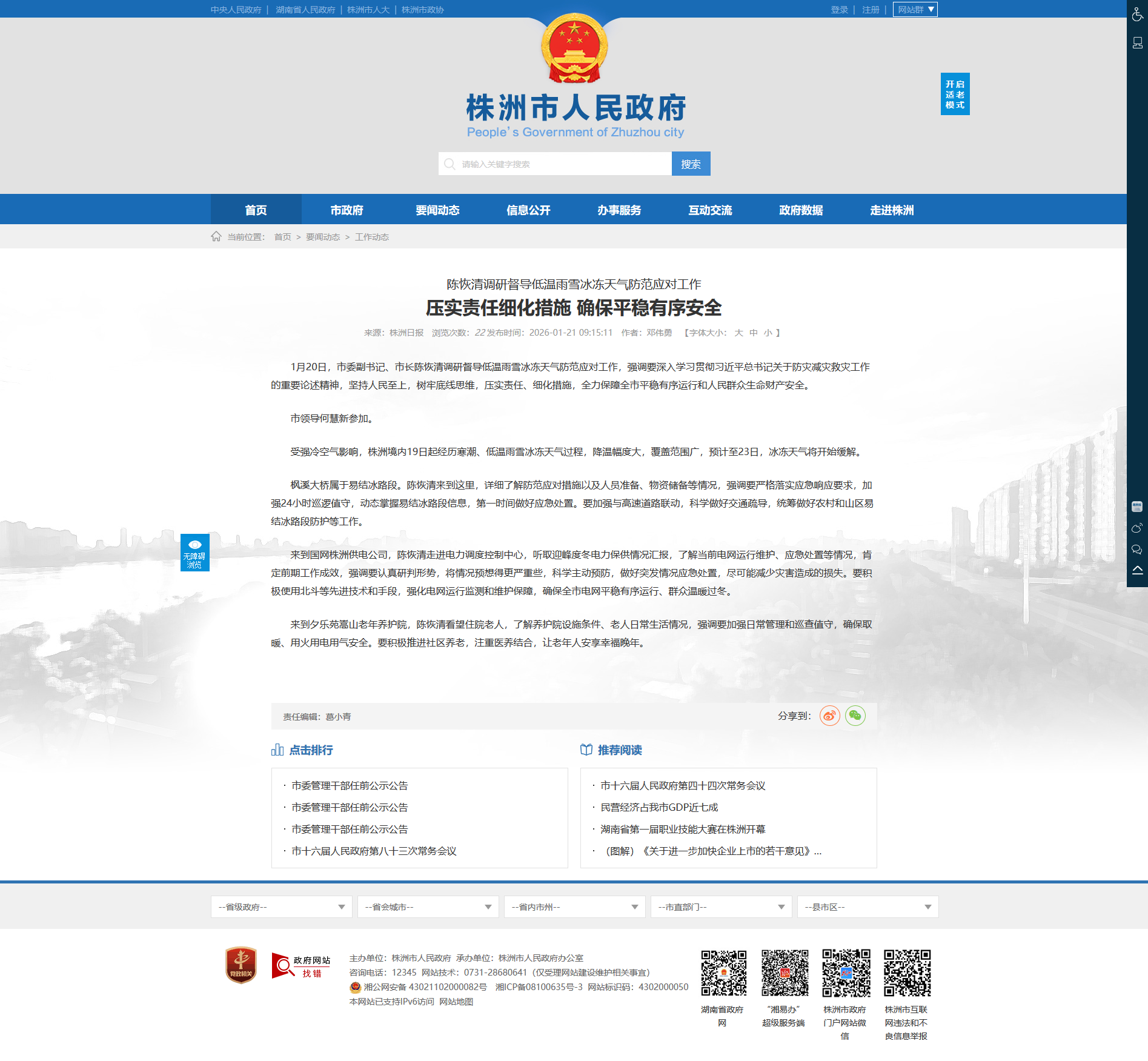 1月20日,市委副书记、市长陈恢清调研督导低温雨雪冰冻天气防范应对工作,强调要深入学习贯彻习近平总书记关于防灾减灾救灾工作的重要论述精神,坚持人民至上,树牢底线思维,压实责任、细化措施,全力保障全市平稳有序运行和人民群众生命财产安全。