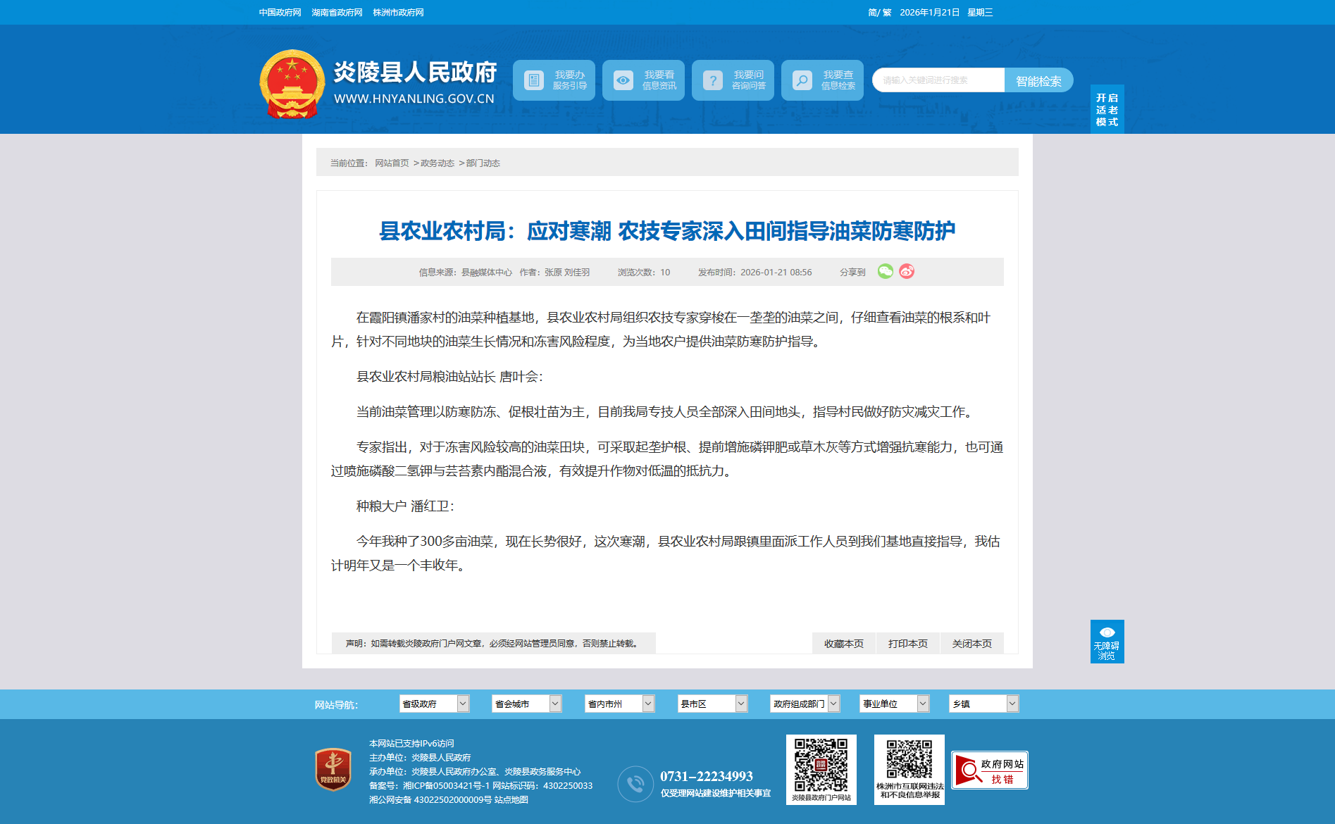 在霞阳镇潘家村的油菜种植基地,县农业农村局组织农技专家穿梭在一垄垄的油菜之间,仔细查看油菜的根系和叶片,针对不同地块的油菜生长情况和冻害风险程度,为当地农户提供油菜防寒防护指导。