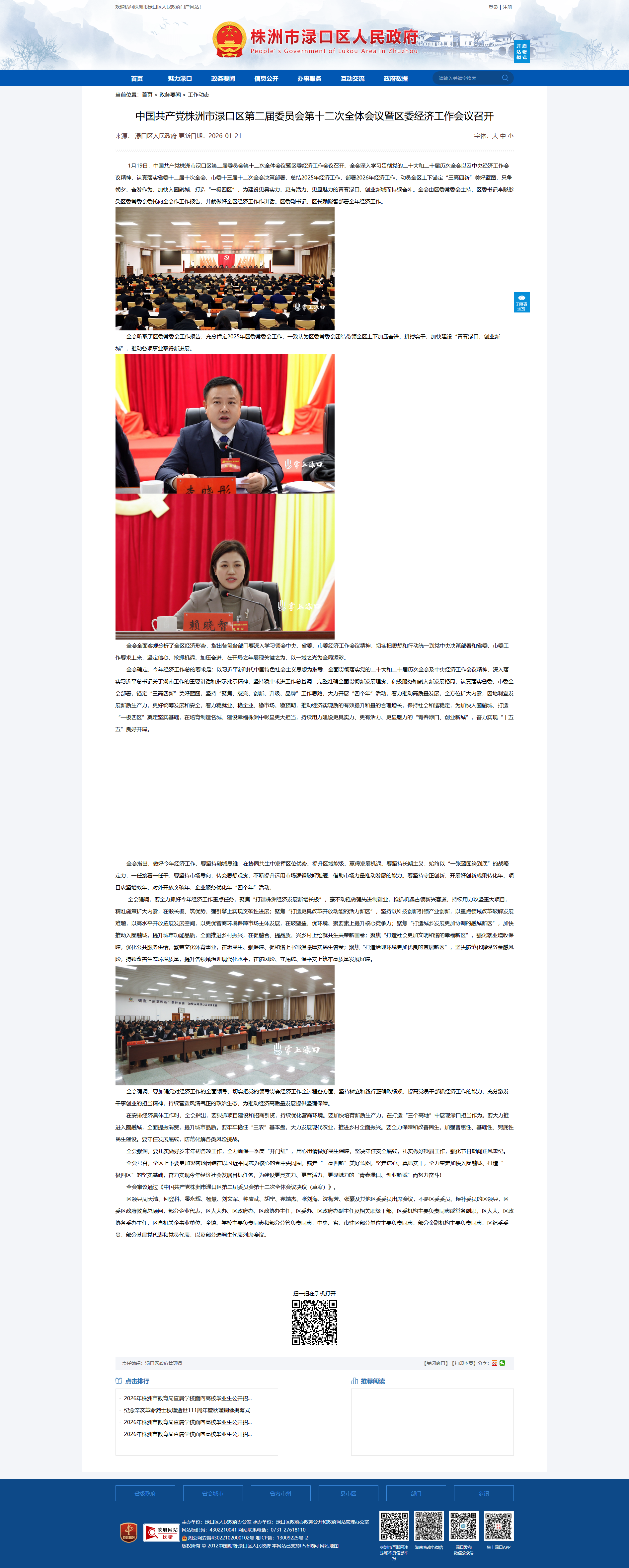 1月19日,中国共产党株洲市渌口区第二届委员会第十二次全体会议暨区委经济工作会议召开。全会深入学习贯彻党的二十大和二十届历次全会以及中央经济工作会议精神,认真落实省委十二届十次全会、市委十三届十二次全会决策部署,总结2025年经济工作,部署2026年经济工作,动员全区上下锚定“三高四新”美好蓝图,只争朝夕、奋发作为,加快入圈融城,打造“一极四区”,为建设更具实力、更有活力、更显魅力的青春渌口、创业新城而持续奋斗。全会由区委常委会主持,区委书记李晓彤受区委常委会委托向全会作工作报告,并就做好全区经济工作作讲话。区委副书记、区长赖晓智部署全年经济工作。