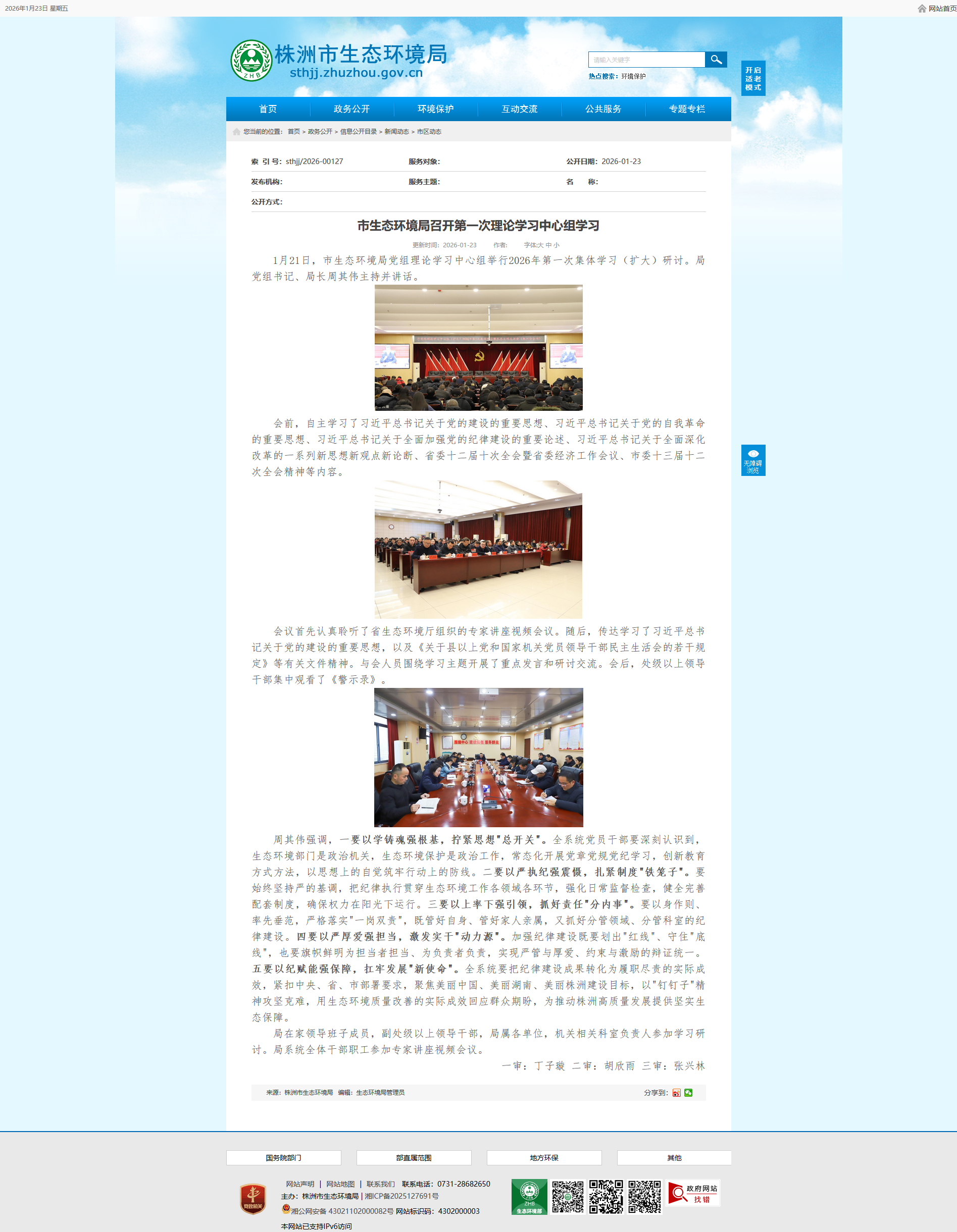 1月21日,市生态环境局党组理论学习中心组举行2026年第一次集体学习(扩大)研讨。局党组书记、局长周其伟主持并讲话。