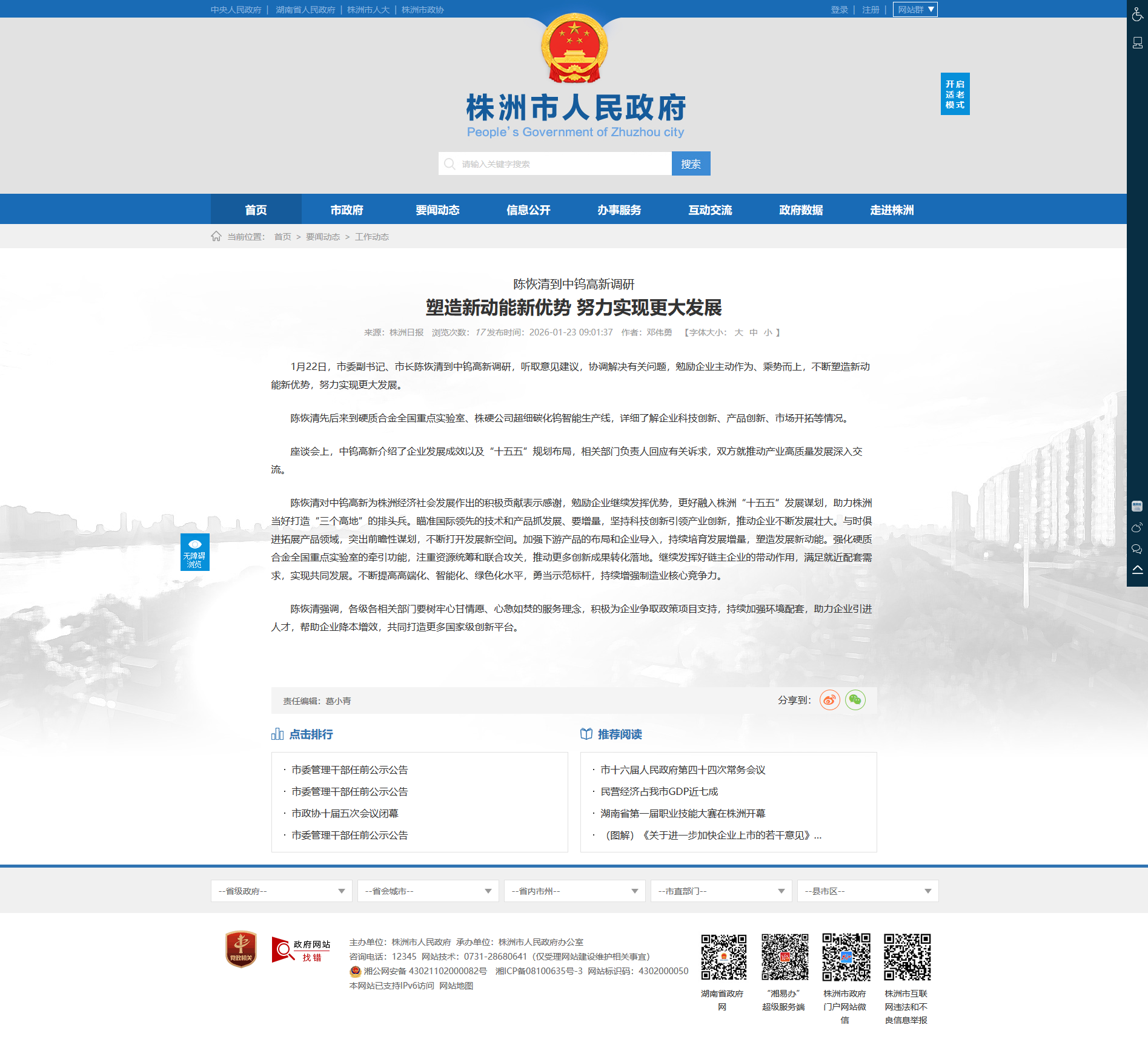 陈恢清对中钨高新为株洲经济社会发展作出的积极贡献表示感谢,勉励企业继续发挥优势,更好融入株洲“十五五”发展谋划,助力株洲当好打造“三个高地”的排头兵。瞄准国际领先的技术和产品抓发展、要增量,坚持科技创新引领产业创新,推动企业不断发展壮大。与时俱进拓展产品领域,突出前瞻性谋划,不断打开发展新空间。加强下游产品的布局和企业导入,持续培育发展增量,塑造发展新动能。强化硬质合金全国重点实验室的牵引功能,注重资源统筹和联合攻关,推动更多创新成果转化落地。继续发挥好链主企业的带动作用,满足就近配套需求,实现共同发展。不断提高高端化、智能化、绿色化水平,勇当示范标杆,持续增强制造业核心竞争力。