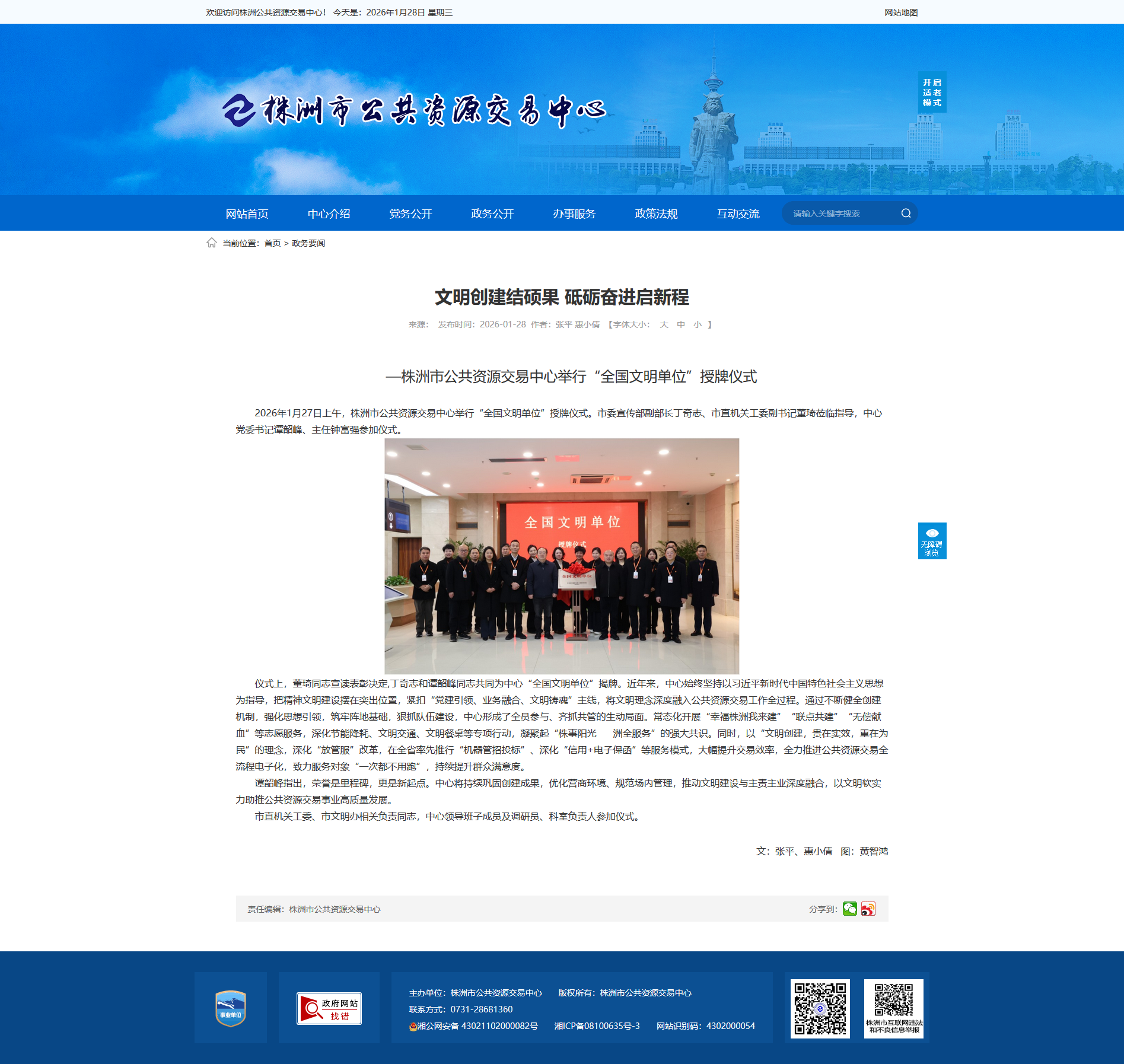 2026年1月27日上午,株洲市公共资源交易中心举行“全国文明单位”授牌仪式。市委宣传部副部长丁奇志、市直机关工委副书记董琦莅临指导,中心党委书记谭韶峰、主任钟富强参加仪式。