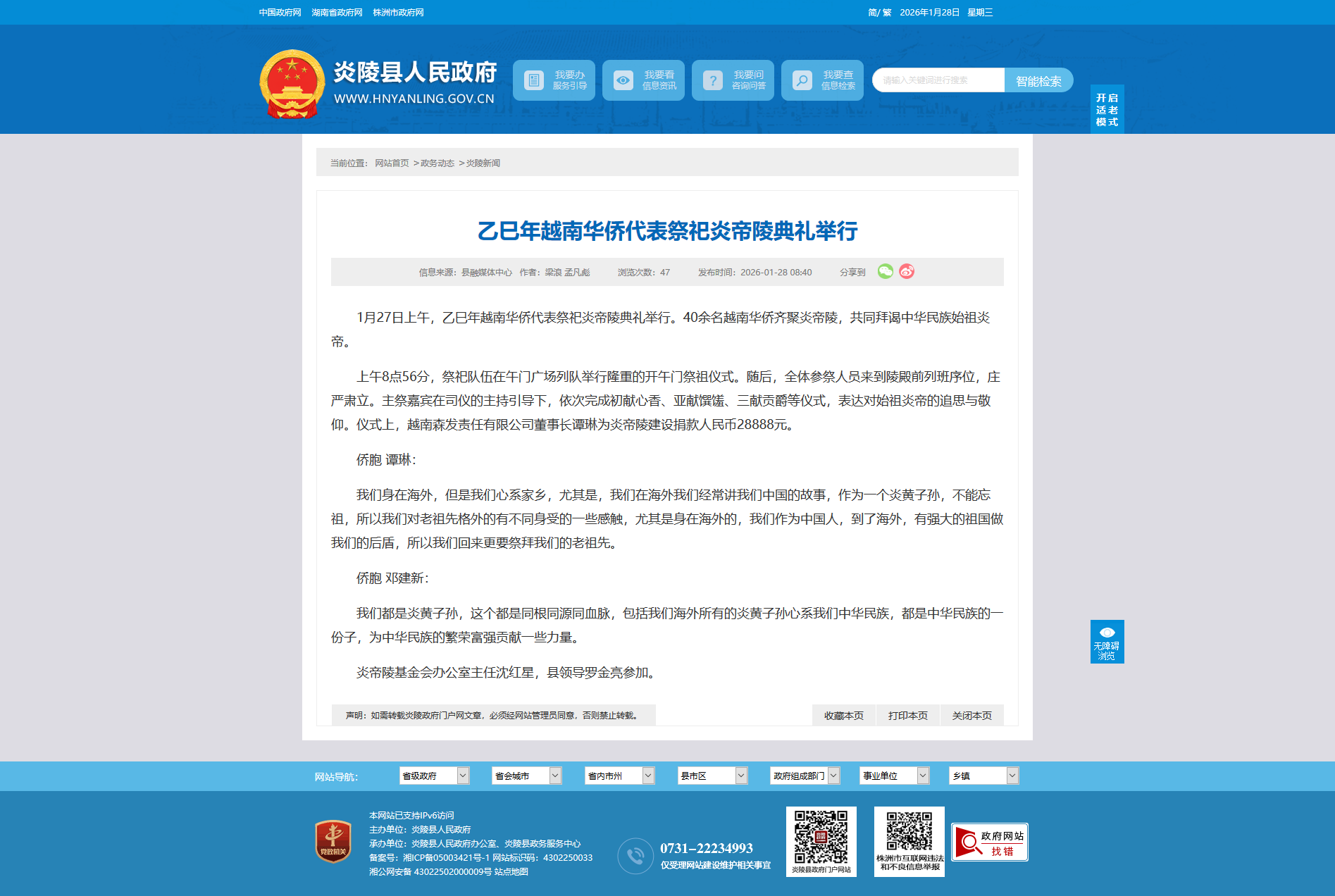 1月27日上午,乙巳年越南华侨代表祭祀炎帝陵典礼举行。40余名越南华侨齐聚炎帝陵,共同拜谒中华民族始祖炎帝。