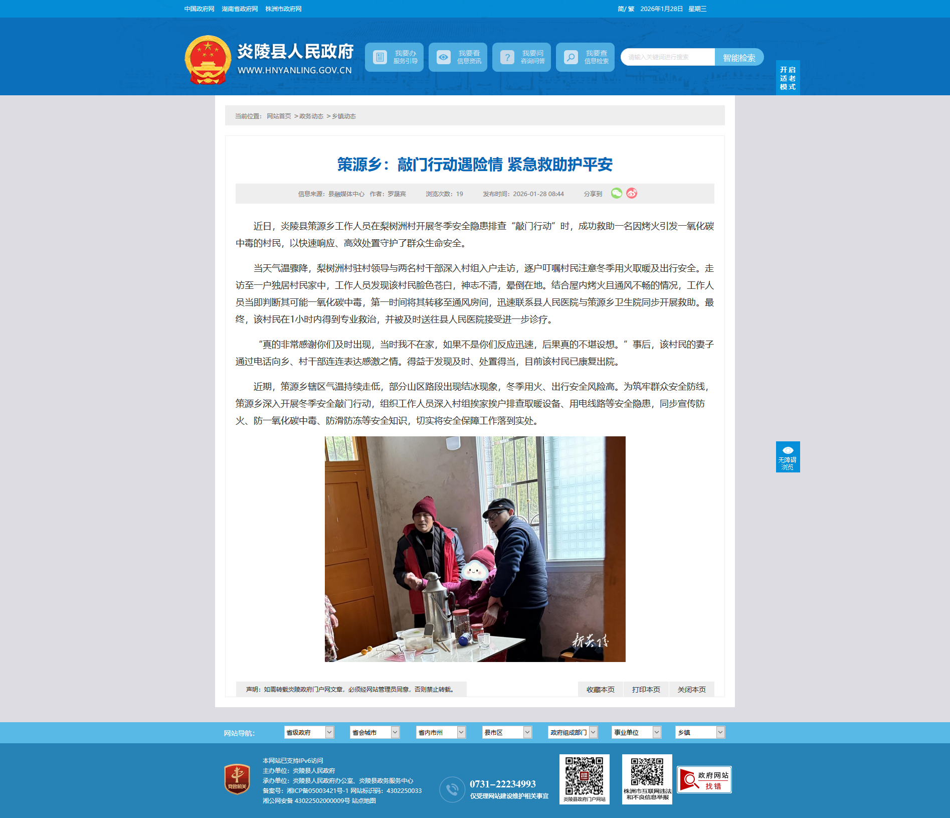 近日,炎陵县策源乡工作人员在梨树洲村开展冬季安全隐患排查“敲门行动”时,成功救助一名因烤火引发一氧化碳中毒的村民,以快速响应、高效处置守护了群众生命安全。