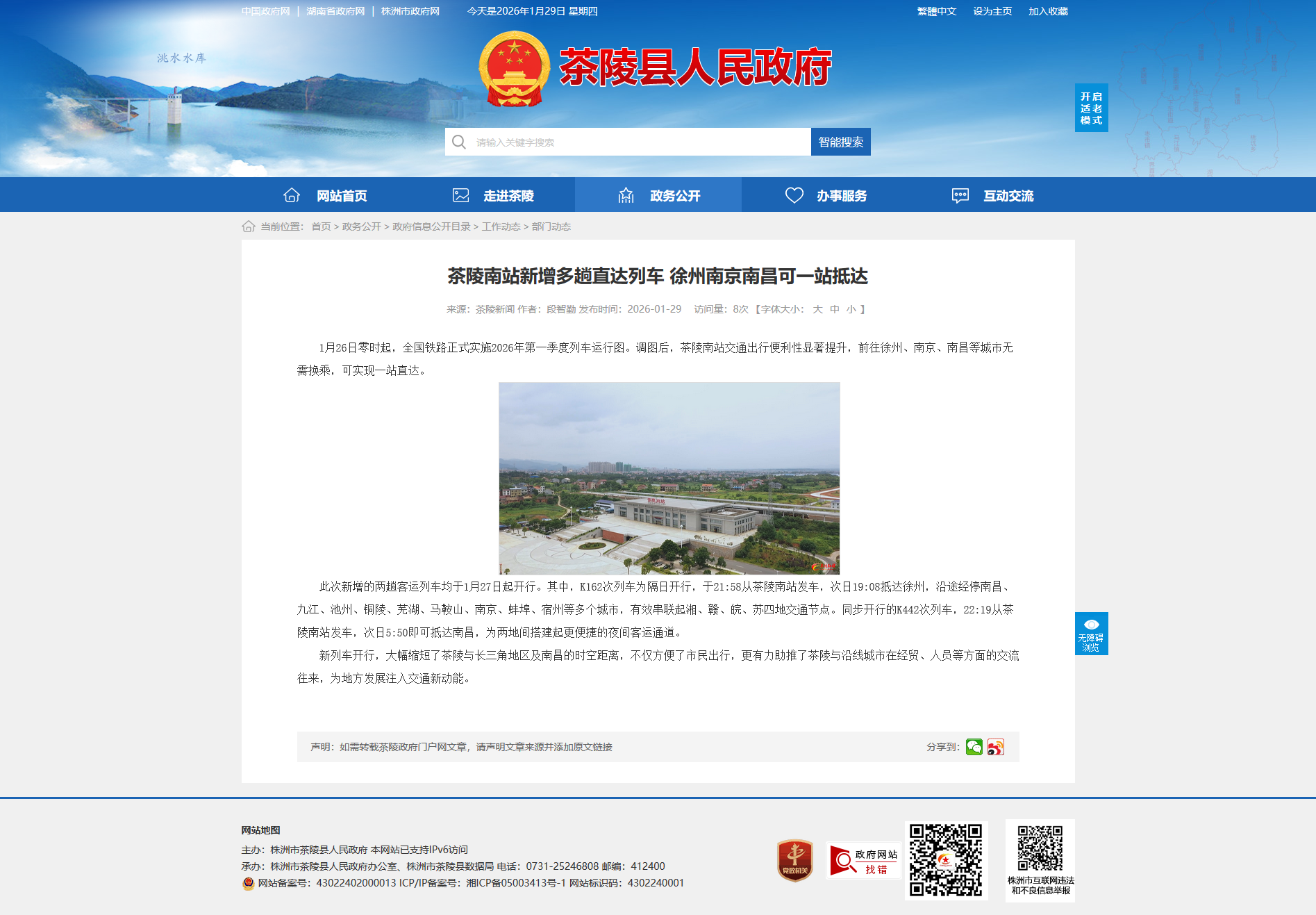 1月26日零时起,全国铁路正式实施2026年第一季度列车运行图。调图后,茶陵南站交通出行便利性显著提升,前往徐州、南京、南昌等城市无需换乘,可实现一站直达。