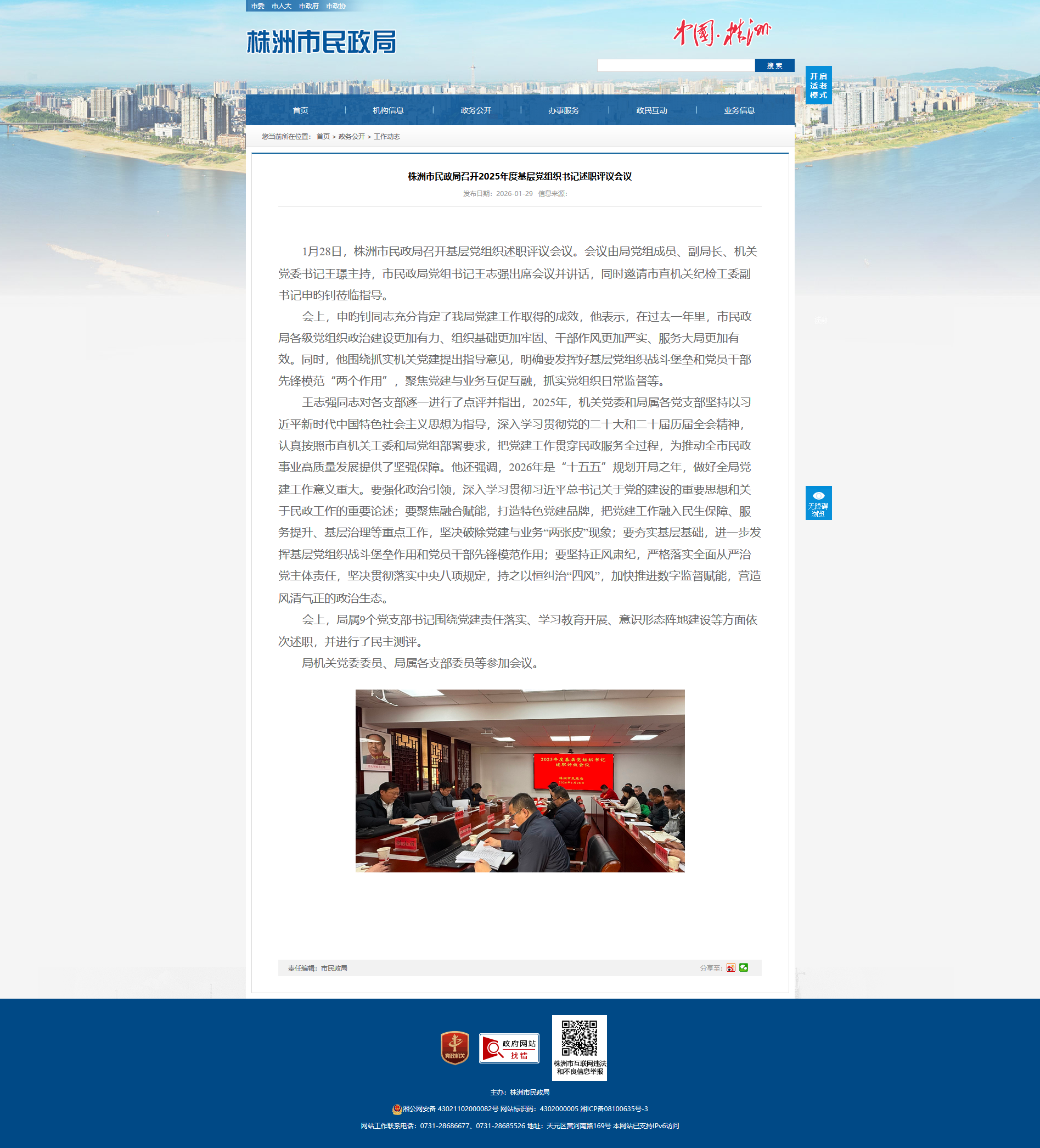 1月28日,株洲市民政局召开基层党组织述职评议会议。会议由局党组成员、副局长、机关党委书记王璟主持,市民政局党组书记王志强出席会议并讲话,同时邀请市直机关纪检工委副书记申昀钊莅临指导。