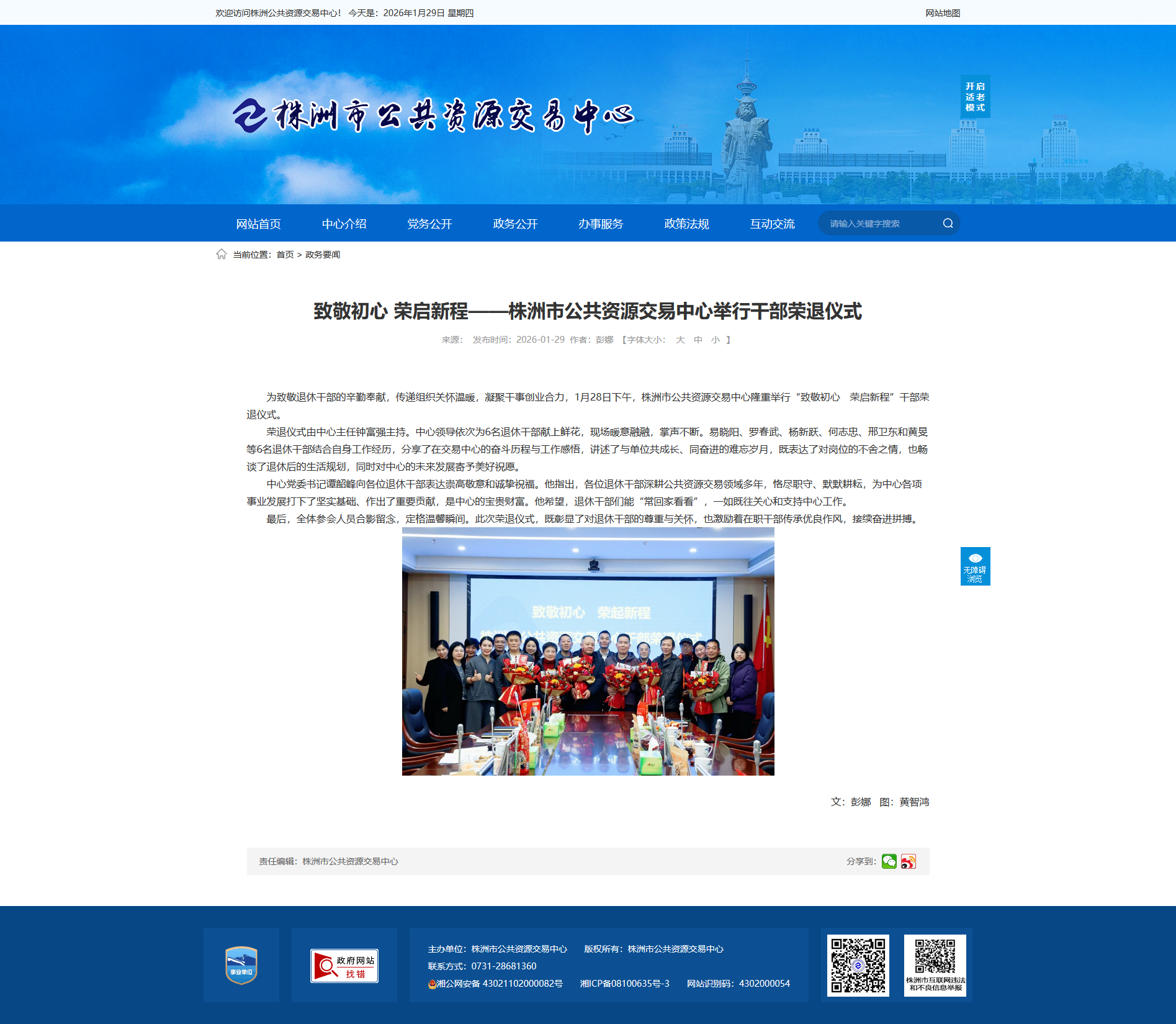 为致敬退休干部的辛勤奉献,传递组织关怀温暖,凝聚干事创业合力,1月28日下午,株洲市公共资源交易中心隆重举行“致敬初心 荣启新程”干部荣退仪式。