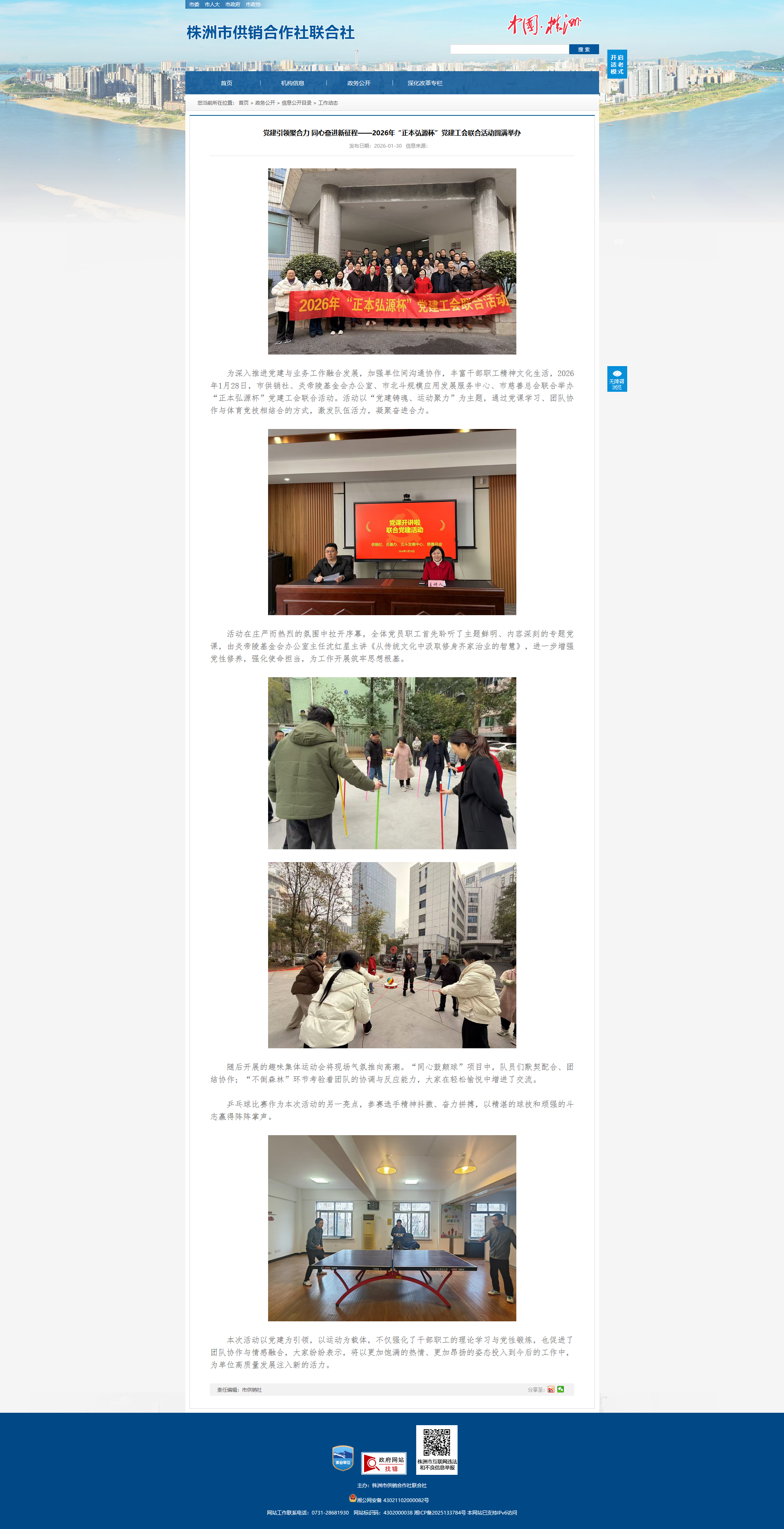 为深入推进党建与业务工作融合发展,加强单位间沟通协作,丰富干部职工精神文化生活,2026年1月28日,市供销社、炎帝陵基金会办公室、市北斗规模应用发展服务中心、市慈善总会联合举办“正本弘源杯”党建工会联合活动。活动以“党建铸魂、运动聚力”为主题,通过党课学习、团队协作与体育竞技相结合的方式,激发队伍活力,凝聚奋进合力。