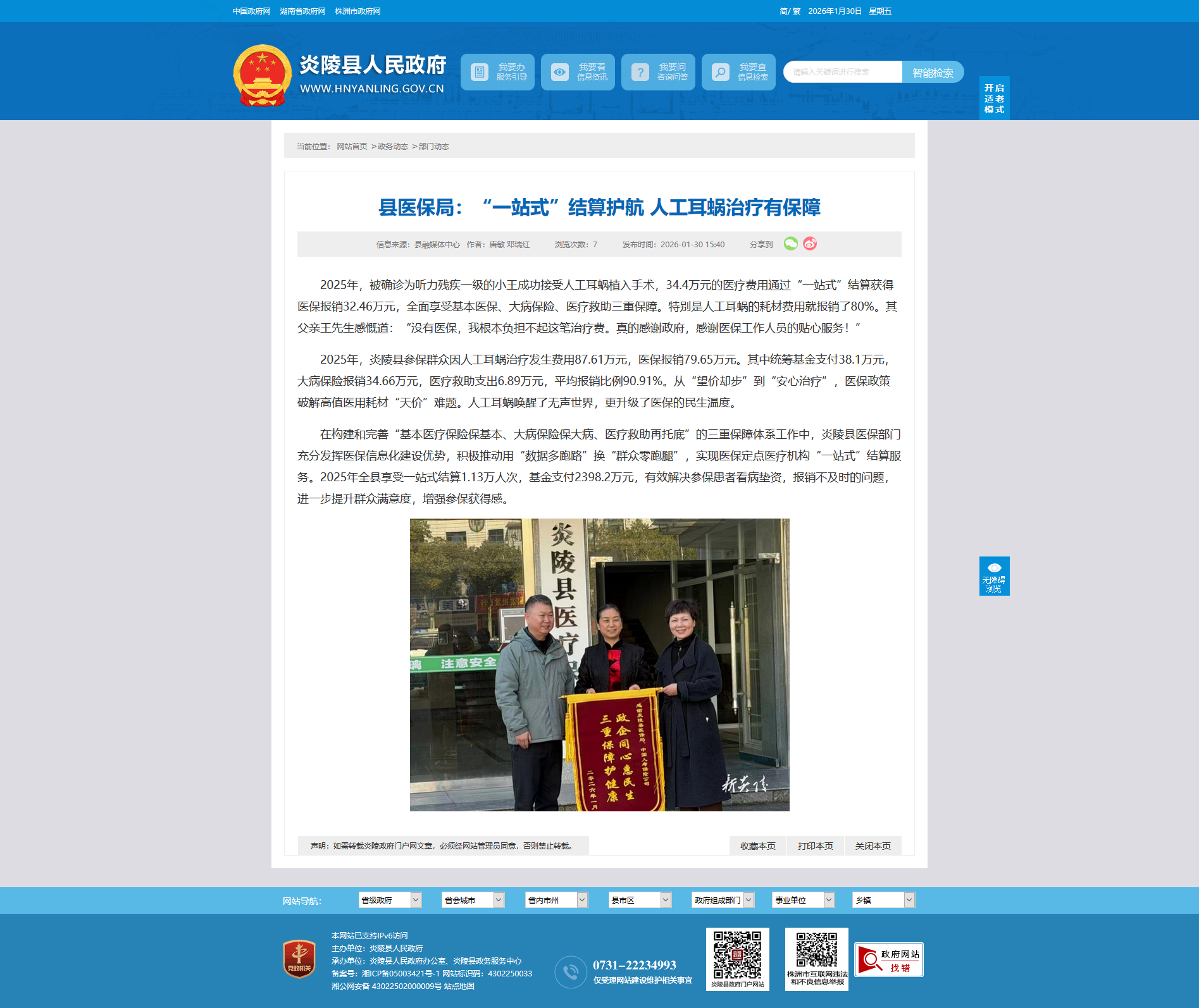 2025年,炎陵县参保群众因人工耳蜗治疗发生费用87.61万元,医保报销79.65万元。其中统筹基金支付38.1万元,大病保险报销34.66万元,医疗救助支出6.89万元,平均报销比例90.91%。从“望价却步”到“安心治疗”,医保政策破解高值医用耗材“天价”难题。人工耳蜗唤醒了无声世界,更升级了医保的民生温度。