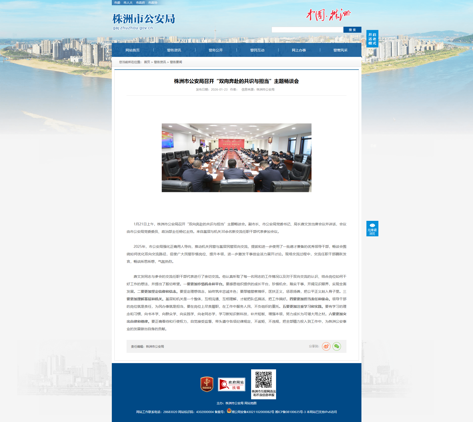 1月21日上午,株洲市公安局召开“双向奔赴的共识与担当”主题畅谈会。副市长、市公安局党委书记、局长唐文发出席会议并讲话,会议由市公安局党委委员、政治部主任杨忆主持。来自基层与机关30余名新交流任职干部代表参加会议。