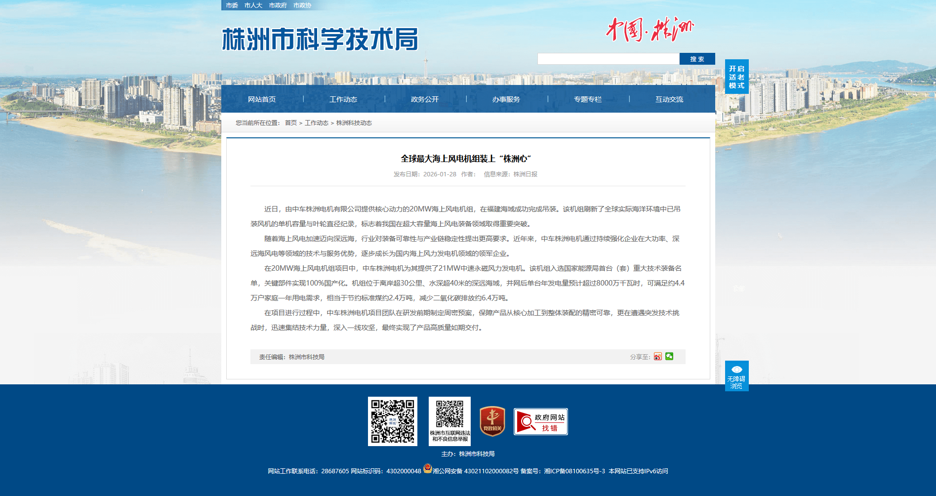 在20MW海上风电机组项目中,中车株洲电机为其提供了21MW中速永磁风力发电机。该机组入选国家能源局首台(套)重大技术装备名单,关键部件实现100%国产化。机组位于离岸超30公里、水深超40米的深远海域,并网后单台年发电量预计超过8000万千瓦时,可满足约4.4万户家庭一年用电需求,相当于节约标准煤约2.4万吨,减少二氧化碳排放约6.4万吨。