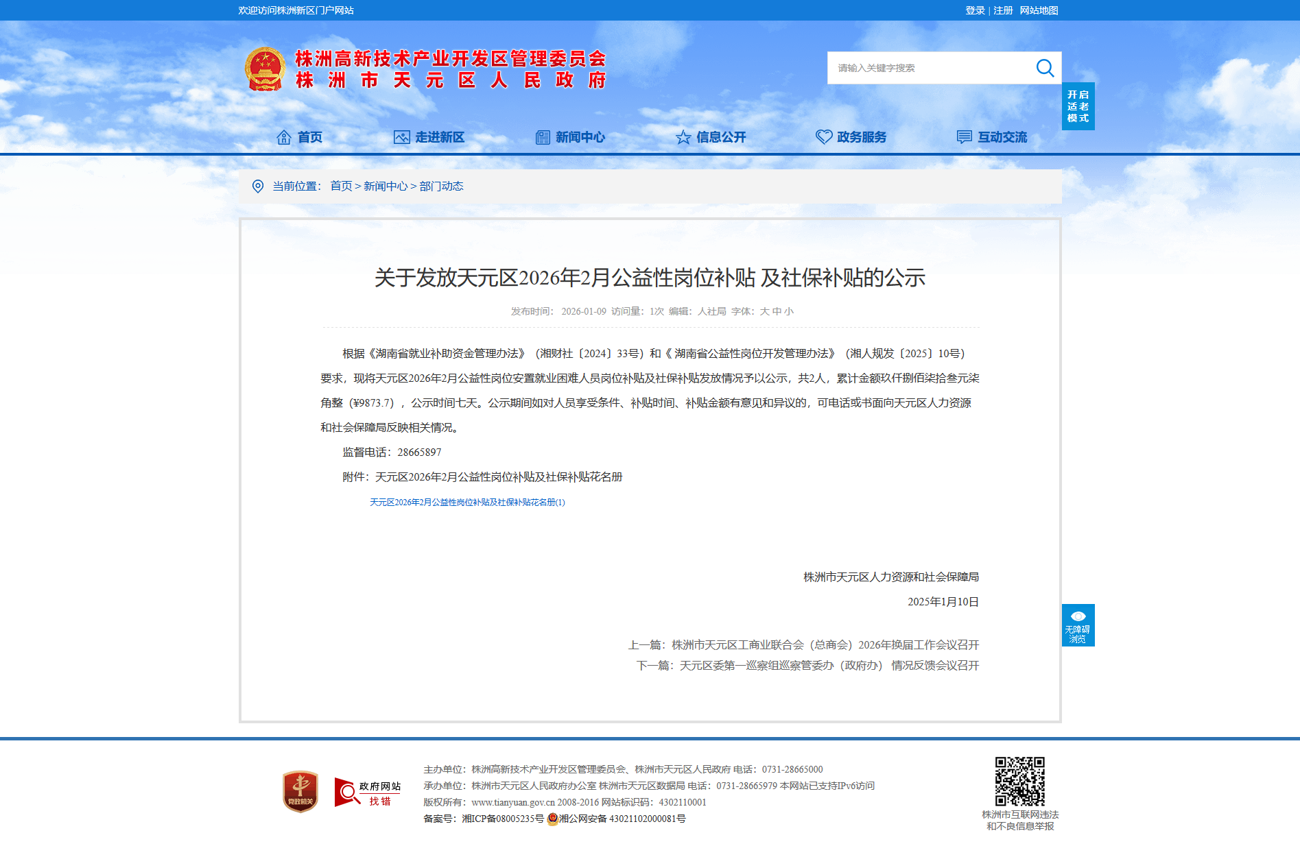 根据《湖南省就业补助资金管理办法》(湘财社〔2024〕33号)和《 湖南省公益性岗位开发管理办法》(湘人规发〔2025〕10号)要求,现将天元区2026年2月公益性岗位安置就业困难人员岗位补贴及社保补贴发放情况予以公示,共2人,累计金额玖仟捌佰柒拾叁元柒角整(¥9873.7),公示时间七天。公示期间如对人员享受条件、补贴时间、补贴金额有意见和异议的,可电话或书面向天元区人力资源和社会保障局反映相关情况。