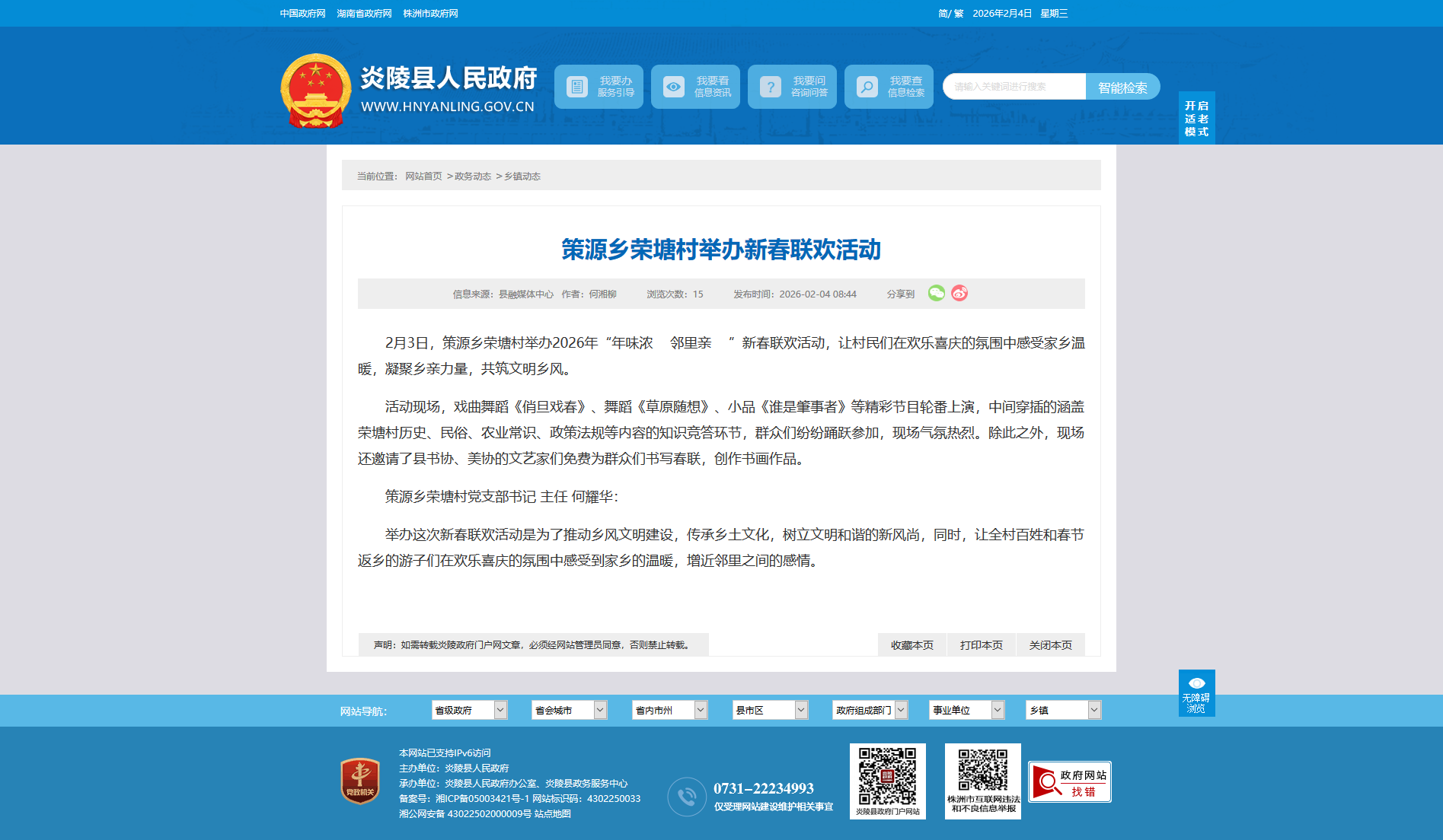2月3日,策源乡荣塘村举办2026年“年味浓 邻里亲 ”新春联欢活动,让村民们在欢乐喜庆的氛围中感受家乡温暖,凝聚乡亲力量,共筑文明乡风。