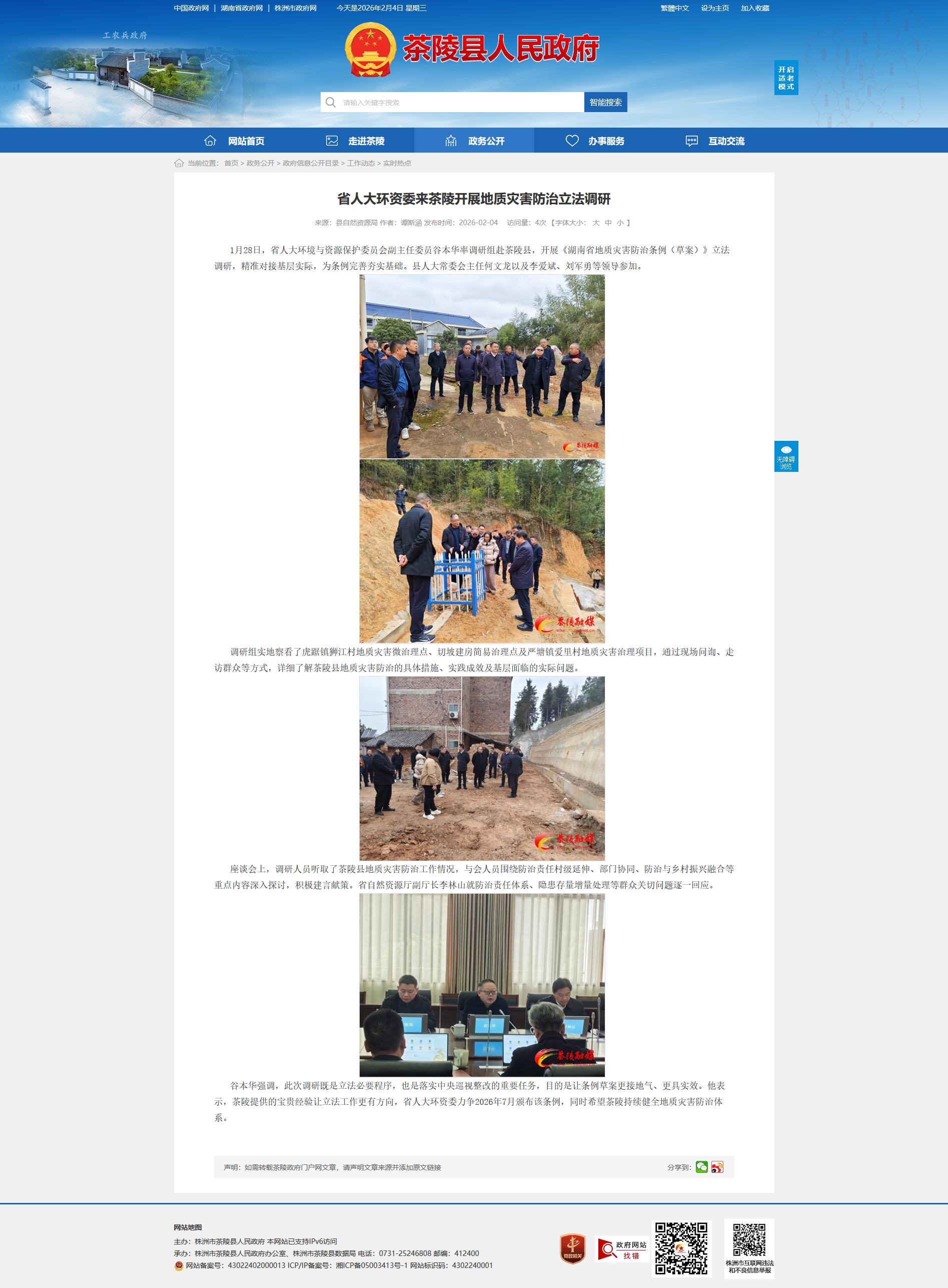 谷本华强调,此次调研既是立法必要程序,也是落实中央巡视整改的重要任务,目的是让条例草案更接地气、更具实效。他表示,茶陵提供的宝贵经验让立法工作更有方向,省人大环资委力争2026年7月颁布该条例,同时希望茶陵持续健全地质灾害防治体系。