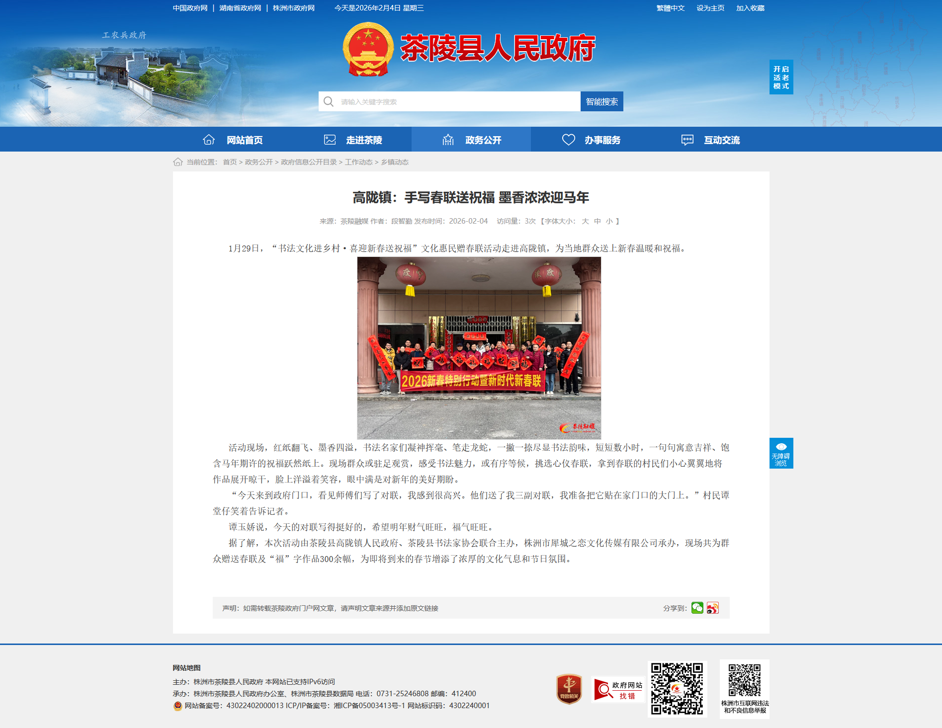 据了解,本次活动由茶陵县高陇镇人民政府、茶陵县书法家协会联合主办,株洲市犀城之恋文化传媒有限公司承办,现场共为群众赠送春联及“福”字作品300余幅,为即将到来的春节增添了浓厚的文化气息和节日氛围。