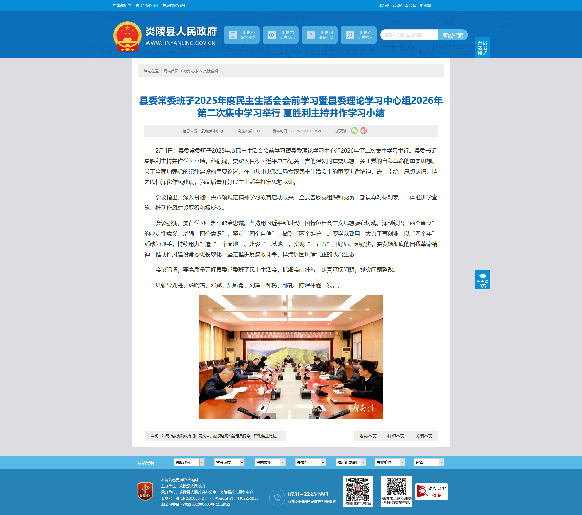 2月4日,县委常委班子2025年度民主生活会会前学习暨县委理论学习中心组2026年第二次集中学习举行。县委书记夏胜利主持并作学习小结。他强调,要深入贯彻习近平总书记关于党的建设的重要思想、关于党的自我革命的重要思想、关于全面加强党的纪律建设的重要论述、在中共中央政治局专题民主生活会上的重要讲话精神,进一步统一思想认识,持之以恒深化作风建设,为高质量开好民主生活会打牢思想基础。