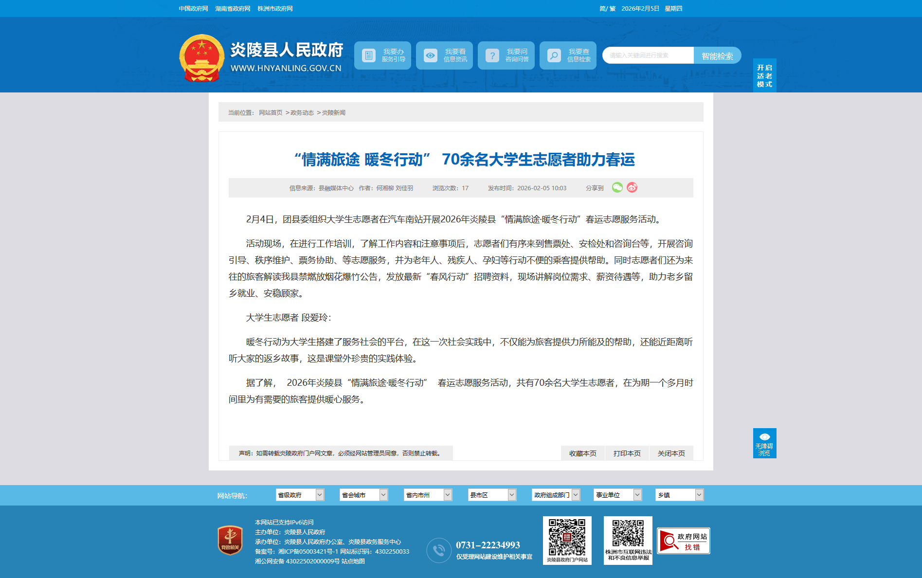 据了解, 2026年炎陵县“情满旅途·暖冬行动” 春运志愿服务活动,共有70余名大学生志愿者,在为期一个多月时间里为有需要的旅客提供暖心服务。