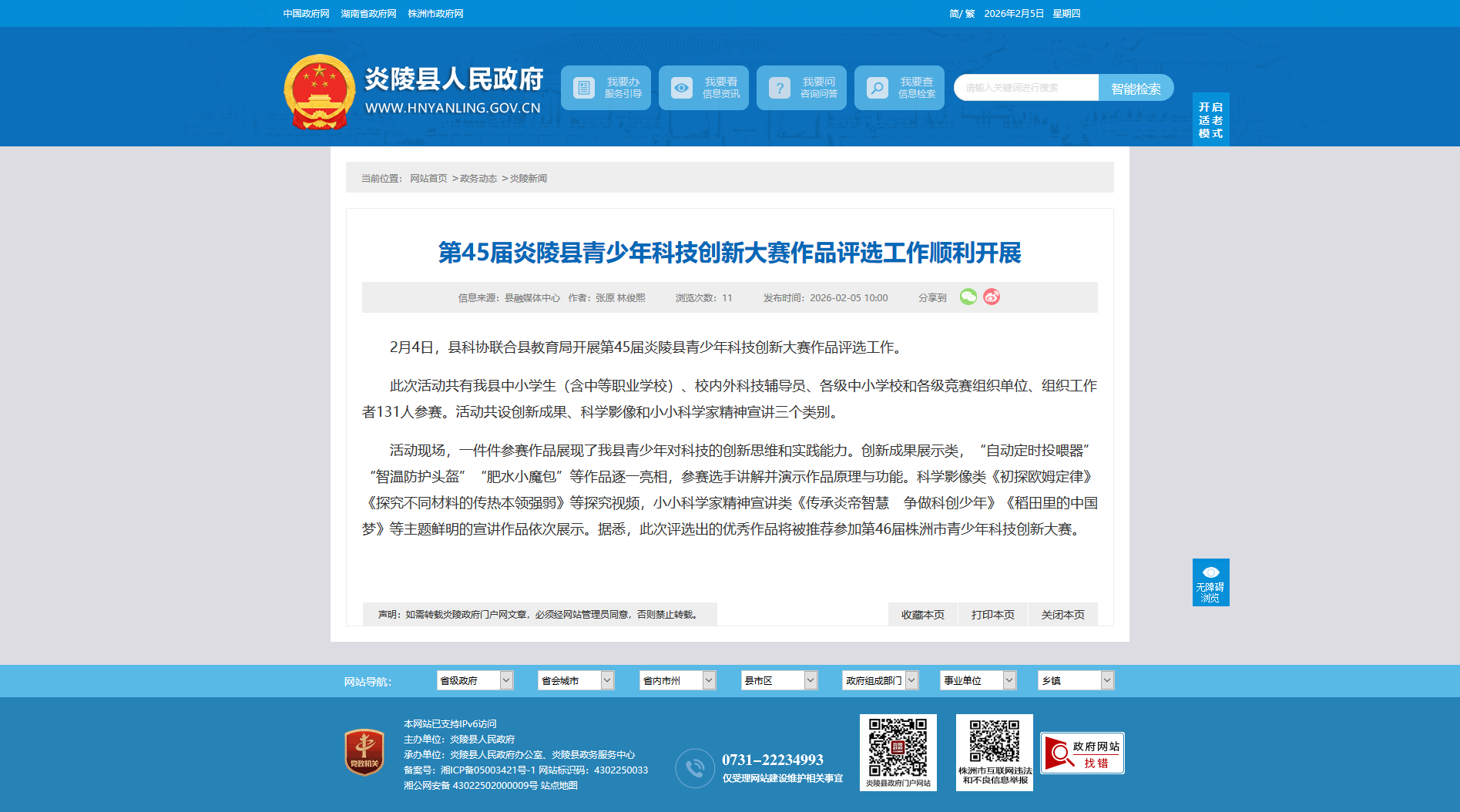 活动现场,一件件参赛作品展现了我县青少年对科技的创新思维和实践能力。创新成果展示类,“自动定时投喂器”“智温防护头盔”“肥水小魔包”等作品逐一亮相,参赛选手讲解并演示作品原理与功能。科学影像类《初探欧姆定律》《探究不同材料的传热本领强弱》等探究视频,小小科学家精神宣讲类《传承炎帝智慧 争做科创少年》《稻田里的中国梦》等主题鲜明的宣讲作品依次展示。据悉,此次评选出的优秀作品将被推荐参加第46届株洲市青少年科技创新大赛。