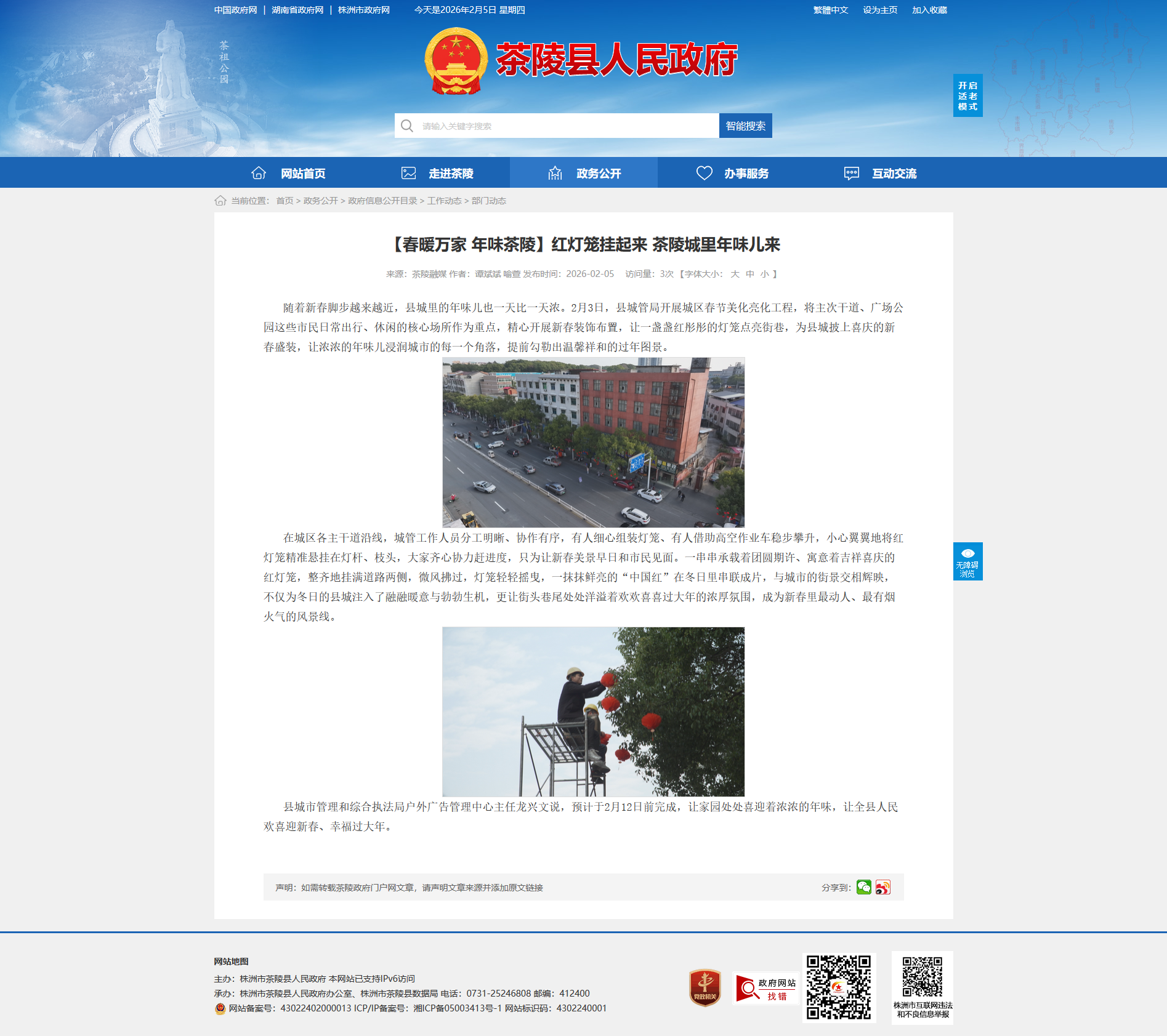 在城区各主干道沿线,城管工作人员分工明晰、协作有序,有人细心组装灯笼、有人借助高空作业车稳步攀升,小心翼翼地将红灯笼精准悬挂在灯杆、枝头,大家齐心协力赶进度,只为让新春美景早日和市民见面。一串串承载着团圆期许、寓意着吉祥喜庆的红灯笼,整齐地挂满道路两侧,微风拂过,灯笼轻轻摇曳,一抹抹鲜亮的“中国红”在冬日里串联成片,与城市的街景交相辉映,不仅为冬日的县城注入了融融暖意与勃勃生机,更让街头巷尾处处洋溢着欢欢喜喜过大年的浓厚氛围,成为新春里最动人、最有烟火气的风景线。