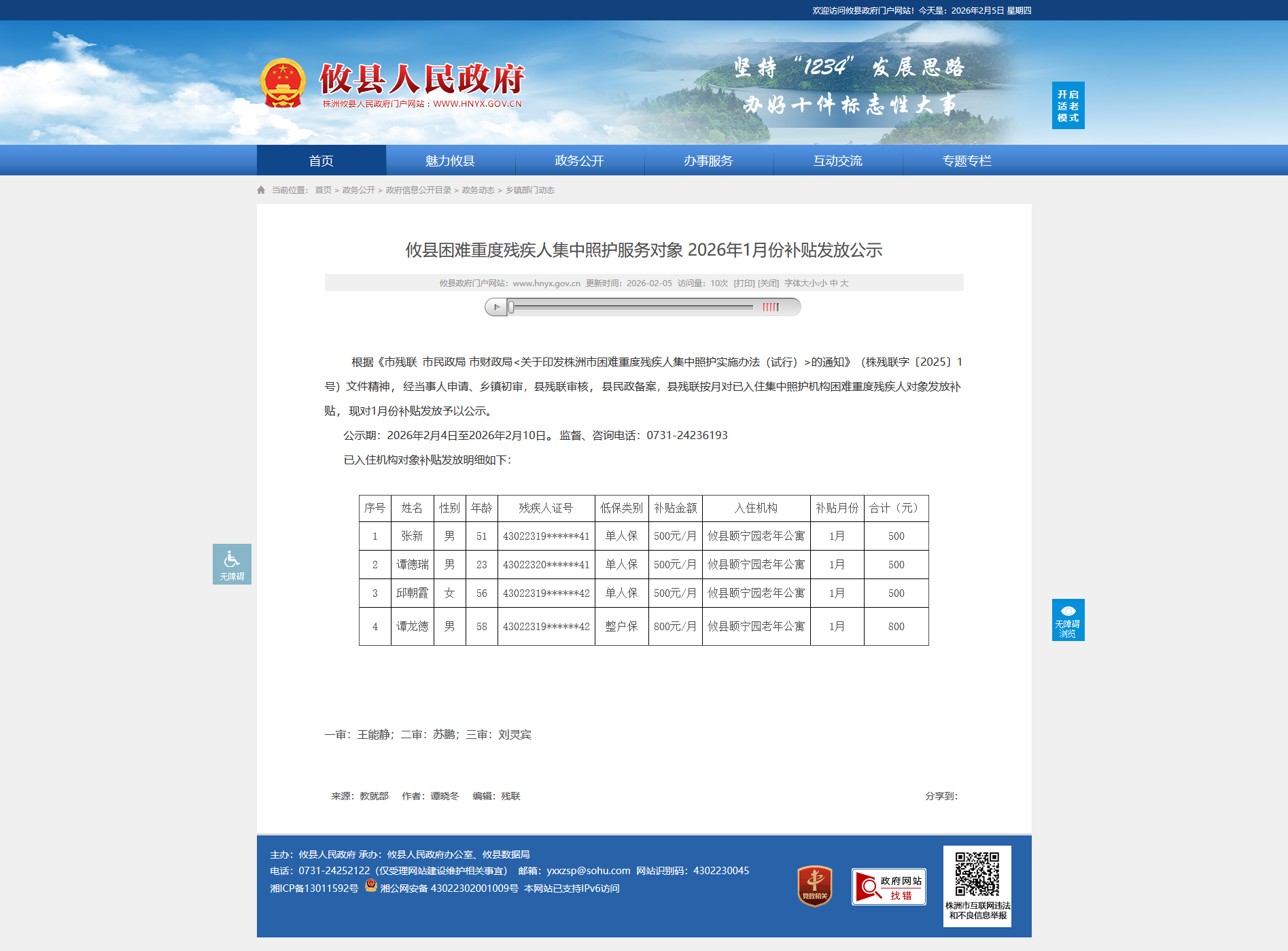 根据《市残联 市民政局 市财政局<关于印发株洲市困难重度残疾人集中照护实施办法(试行)>的通知》(株残联字〔2025〕1号)文件精神,经当事人申请、乡镇初审,县残联审核,县民政备案,县残联按月对已入住集中照护机构困难重度残疾人对象发放补贴,现对1月份补贴发放予以公示。