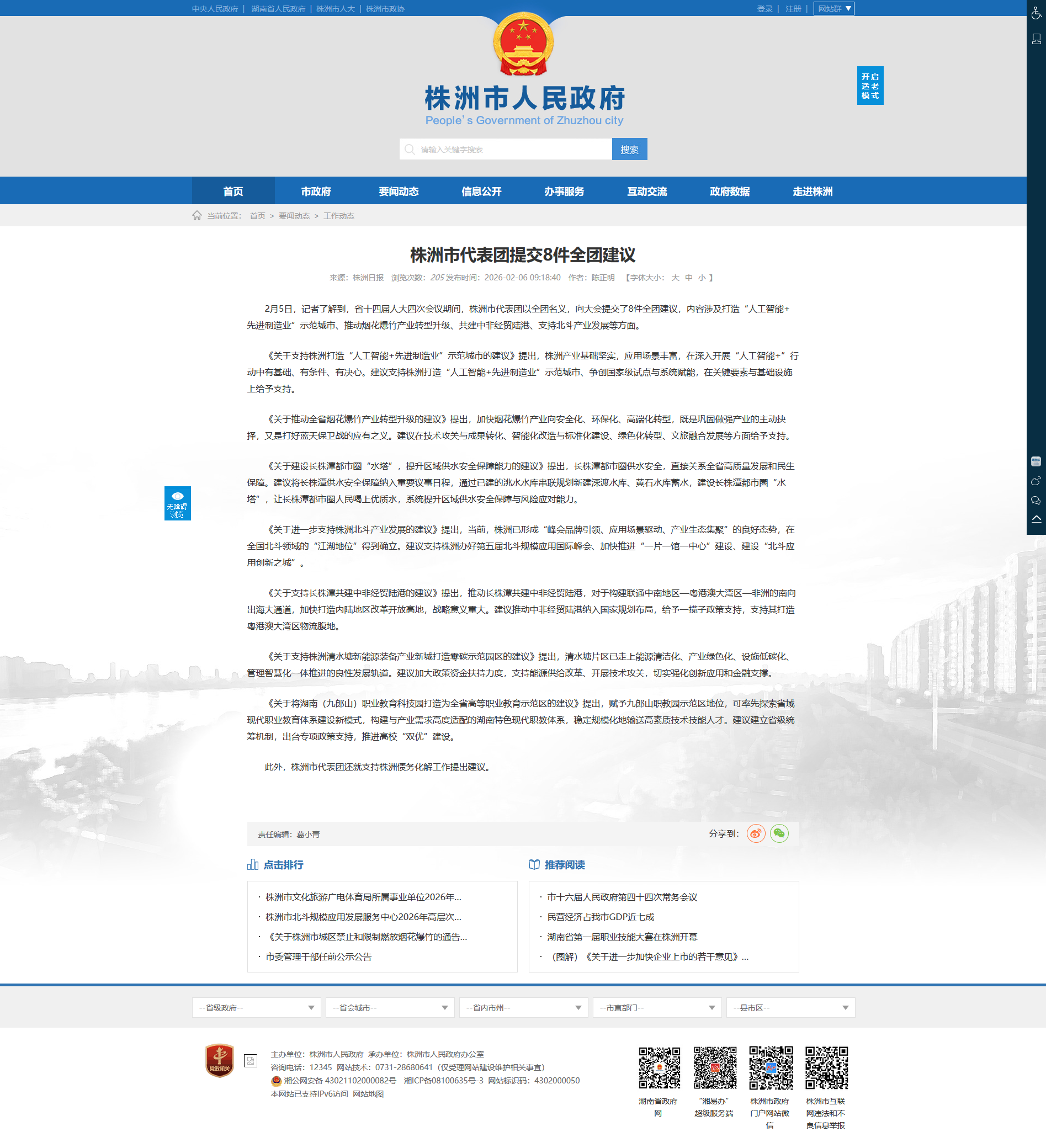 2月5日,记者了解到,省十四届人大四次会议期间,株洲市代表团以全团名义,向大会提交了8件全团建议,内容涉及打造“人工智能 先进制造业”示范城市、推动烟花爆竹产业转型升级、共建中非经贸陆港、支持北斗产业发展等方面。