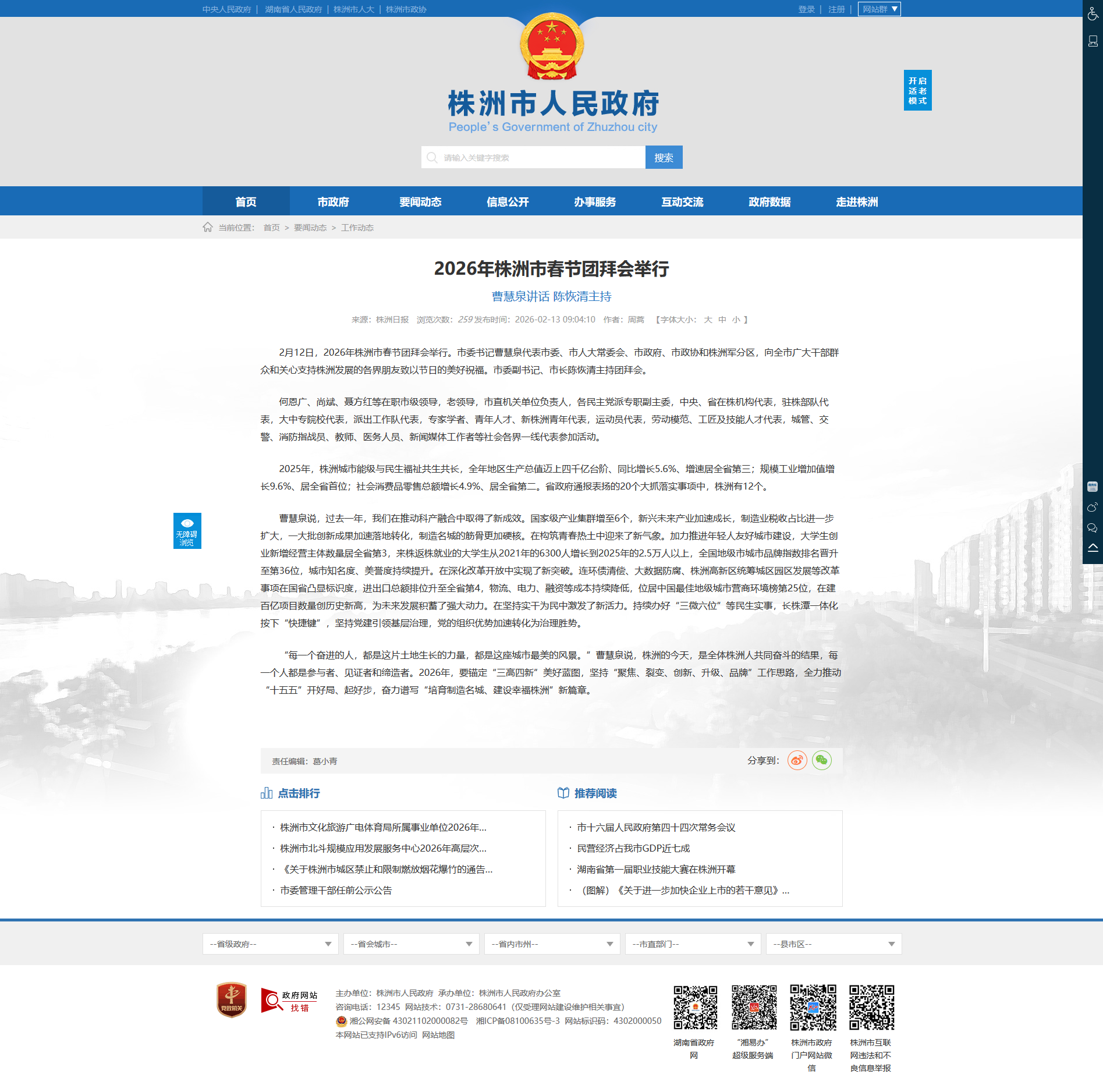 2月12日,2026年株洲市春节团拜会举行。市委书记曹慧泉代表市委、市人大常委会、市政府、市政协和株洲军分区,向全市广大干部群众和关心支持株洲发展的各界朋友致以节日的美好祝福。市委副书记、市长陈恢清主持团拜会。
