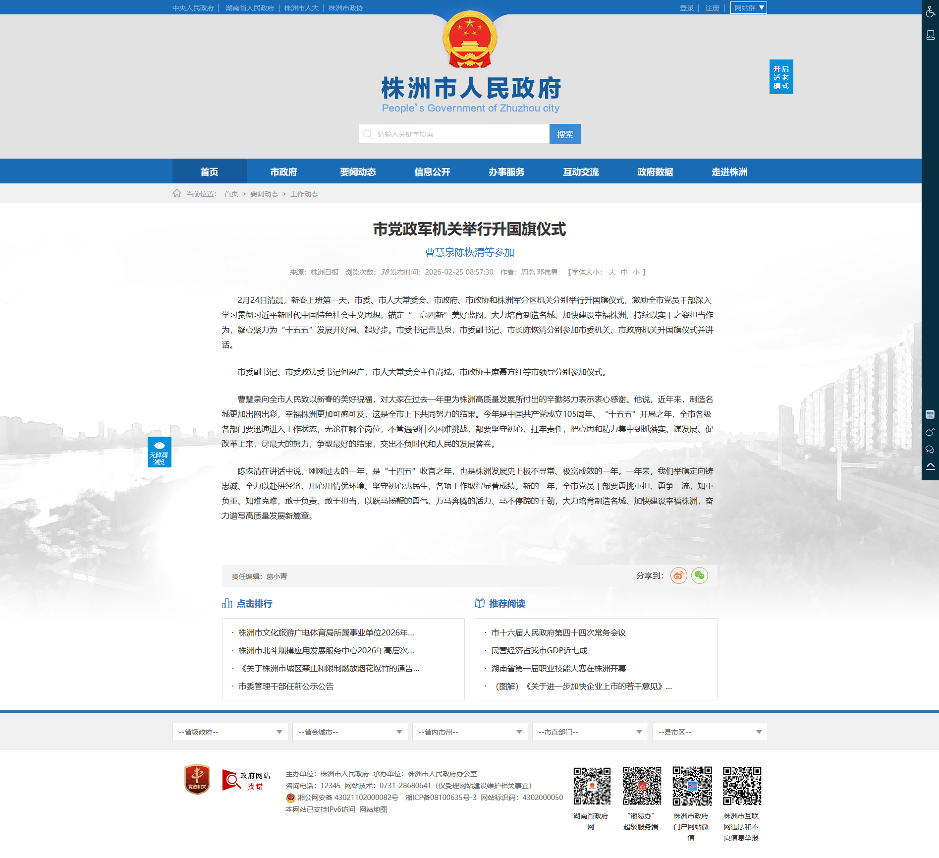 2月24日清晨,新春上班第一天,市委、市人大常委会、市政府、市政协和株洲军分区机关分别举行升国旗仪式,激励全市党员干部深入学习贯彻习近平新时代中国特色社会主义思想,锚定“三高四新”美好蓝图,大力培育制造名城、加快建设幸福株洲,持续以实干之姿担当作为,凝心聚力为“十五五”发展开好局、起好步。市委书记曹慧泉,市委副书记、市长陈恢清分别参加市委机关、市政府机关升国旗仪式并讲话。