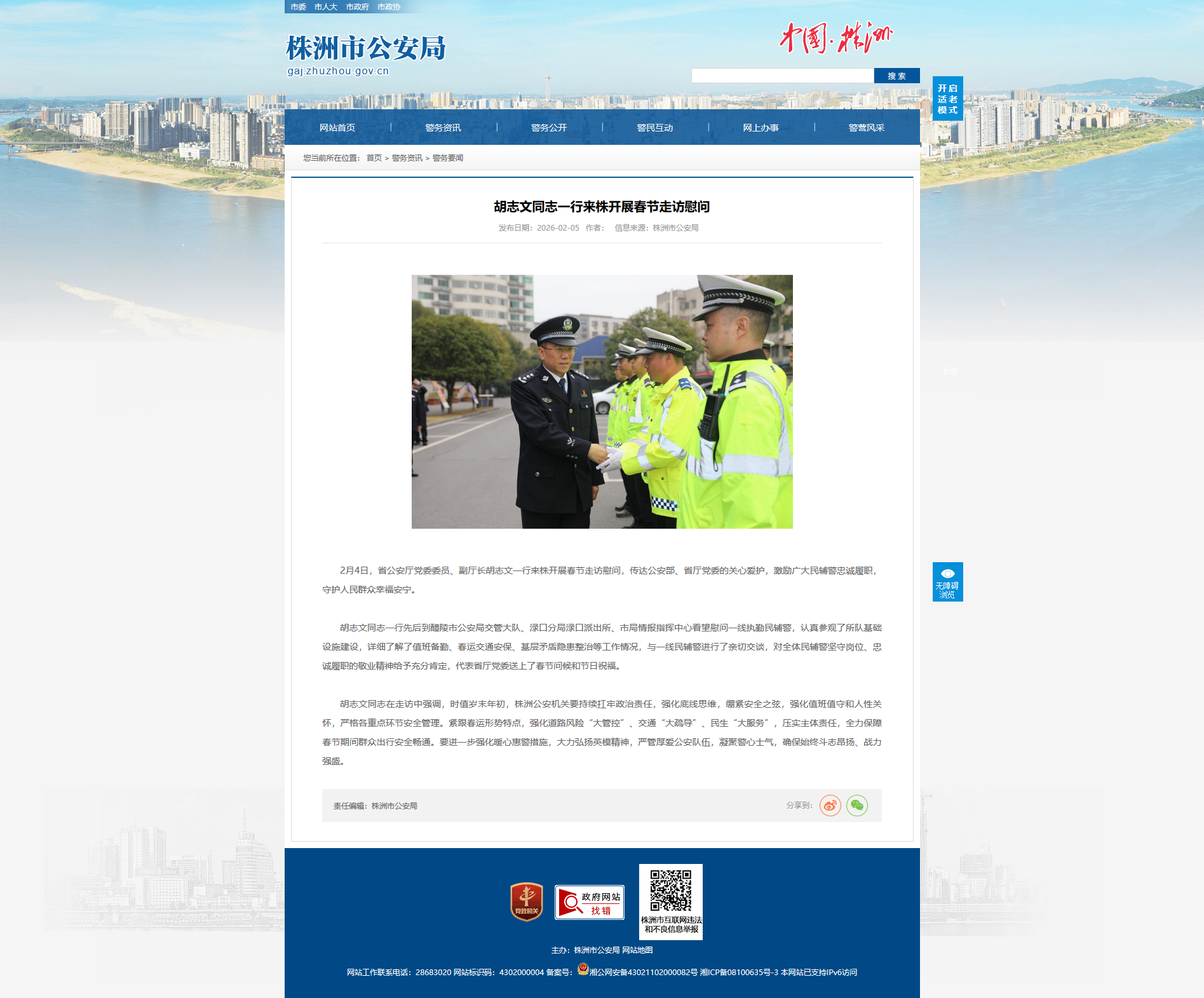 2月4日,省公安厅党委委员、副厅长胡志文一行来株开展春节走访慰问,传达公安部、省厅党委的关心爱护,激励广大民辅警忠诚履职,守护人民群众幸福安宁。