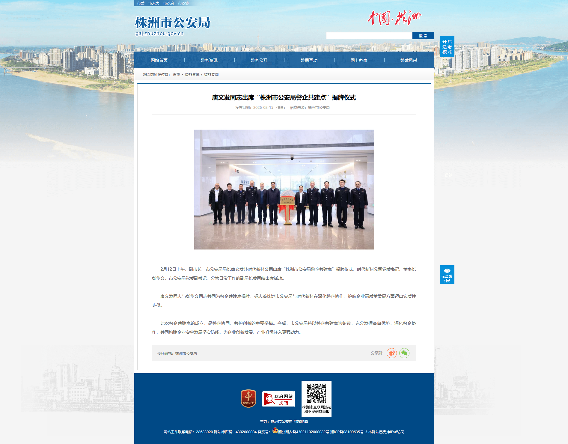 唐文发同志与彭华文同志共同为警企共建点揭牌,标志着株洲市公安局与时代新材在深化警企协作、护航企业高质量发展方面迈出实质性步伐。