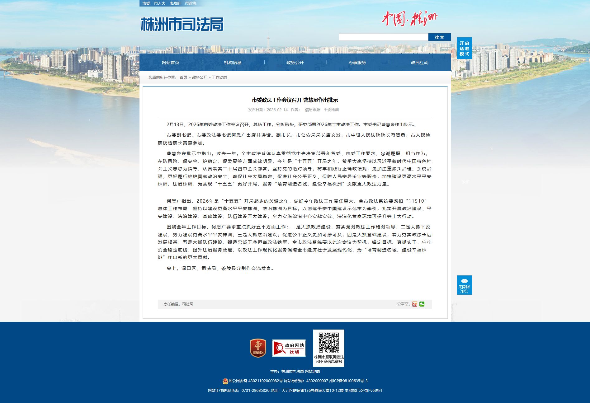 曹慧泉在批示中指出,过去一年,全市政法系统认真贯彻党中央决策部署和省委、市委工作要求,忠诚履职、担当作为,在防风险、保安全、护稳定、促发展等方面成效明显。今年是“十五五”开局之年,希望大家坚持以习近平新时代中国特色社会主义思想为指导,认真落实二十届四中全会部署,坚持党的绝对领导,树牢和践行正确政绩观,更加注重源头治理、系统治理,更好履行维护国家政治安全、确保社会大局稳定、促进社会公平正义、保障人民安居乐业等职责,加快建设更高水平平安株洲、法治株洲,为实现“十五五”良好开局、服务“培育制造名城、建设幸福株洲”贡献更大政法力量。