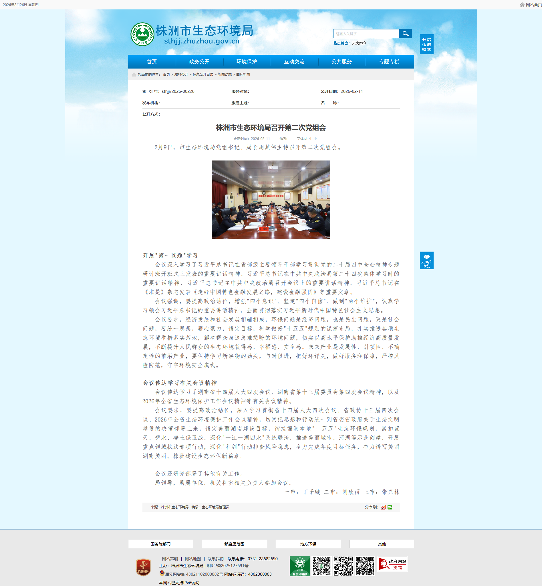会议传达学习了湖南省十四届人大四次会议、湖南省第十三届委员会第四次会议精神,以及2026年全省生态环境保护工作会议精神等有关会议精神。