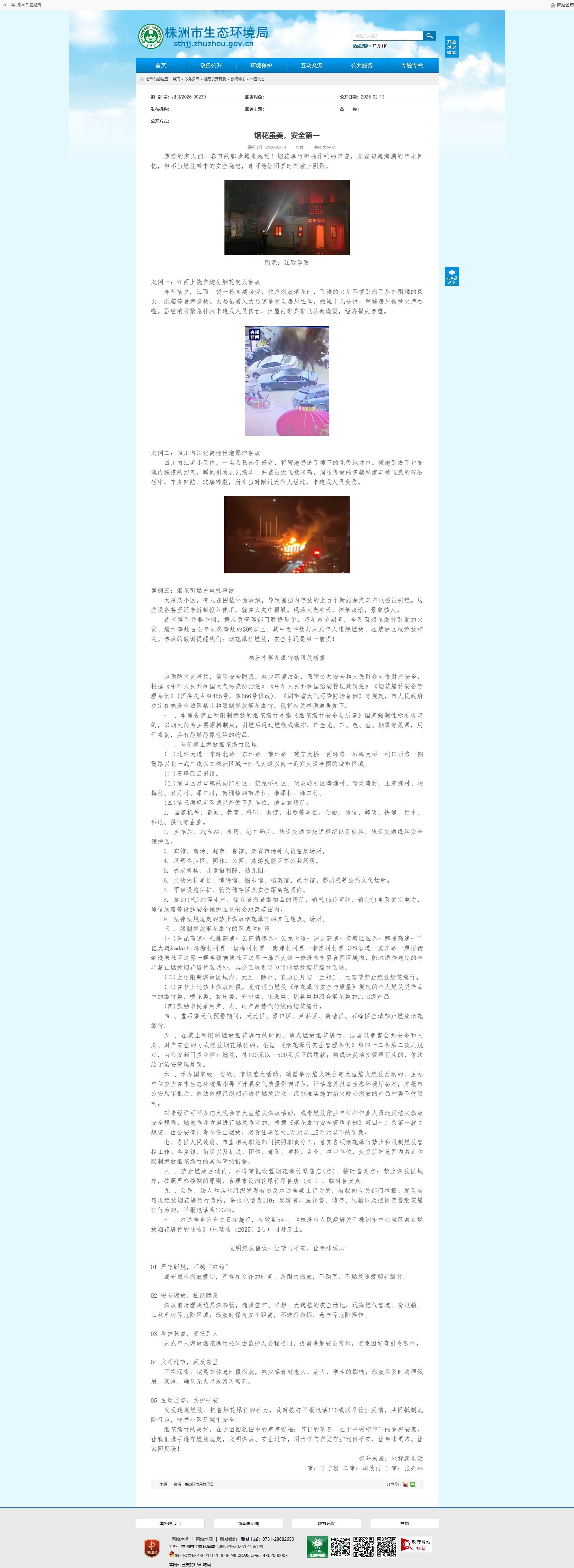 为预防火灾事故,消除安全隐患,减少环境污染,保障公共安全和人民群众生命财产安全,根据《中华人民共和国大气污染防治法》《中华人民共和国治安管理处罚法》《烟花爆竹安全管理条例》(国务院令第455号,第666号修改)、《湖南省大气污染防治条例》等规定,市人民政府决定在株洲市城区禁止和限制燃放烟花爆竹。现将有关事项通告如下: