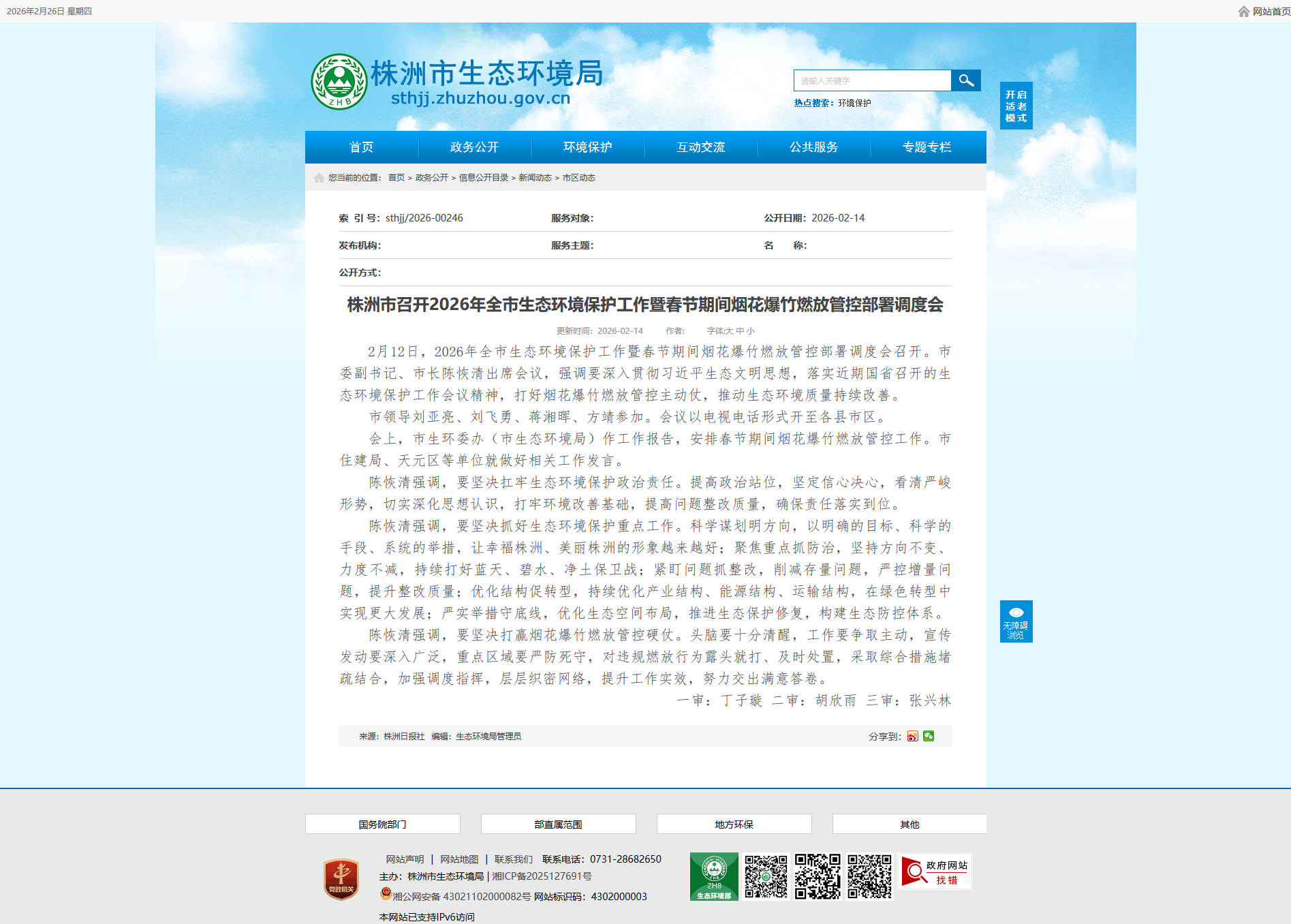 2月12日,2026年全市生态环境保护工作暨春节期间烟花爆竹燃放管控部署调度会召开。市委副书记、市长陈恢清出席会议,强调要深入贯彻习近平生态文明思想,落实近期国省召开的生态环境保护工作会议精神,打好烟花爆竹燃放管控主动仗,推动生态环境质量持续改善。