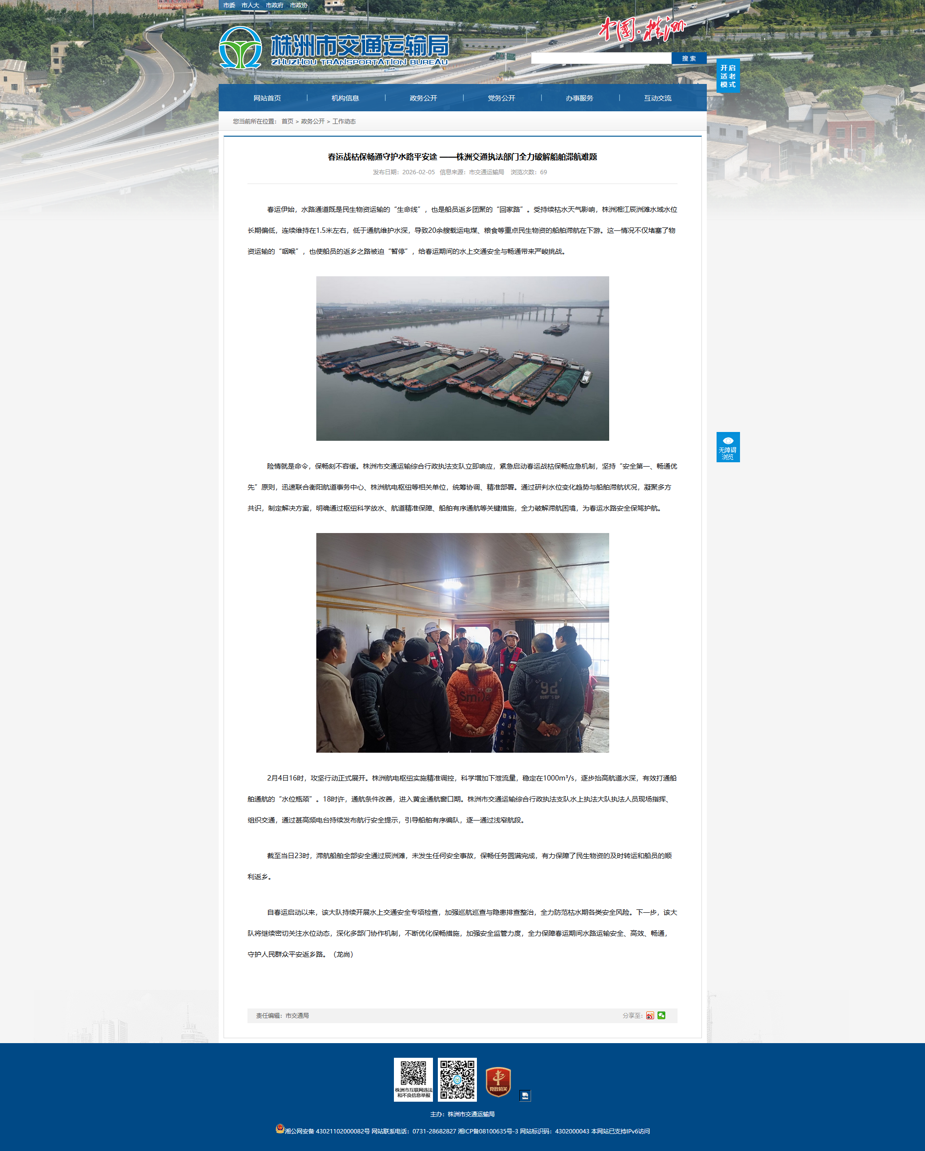 险情就是命令,保畅刻不容缓。株洲市交通运输综合行政执法支队立即响应,紧急启动春运战枯保畅应急机制,坚持“安全第一、畅通优先”原则,迅速联合衡阳航道事务中心、株洲航电枢纽等相关单位,统筹协调、精准部署。通过研判水位变化趋势与船舶滞航状况,凝聚多方共识,制定解决方案,明确通过枢纽科学放水、航道精准保障、船舶有序通航等关键措施,全力破解滞航困境,为春运水路安全保驾护航。