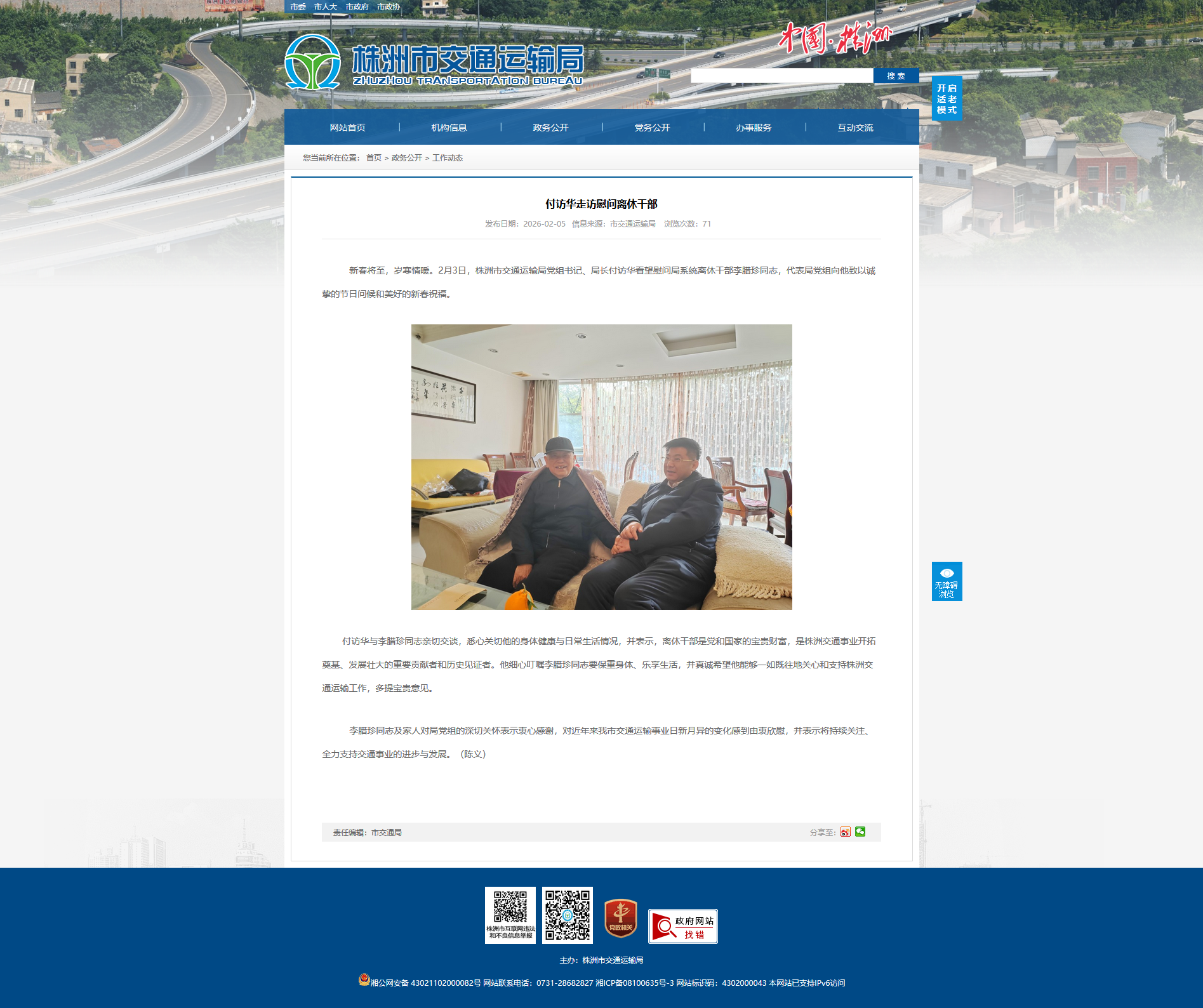 新春将至,岁寒情暖。2月3日,株洲市交通运输局党组书记、局长付访华看望慰问局系统离休干部李腊珍同志,代表局党组向他致以诚挚的节日问候和美好的新春祝福。
