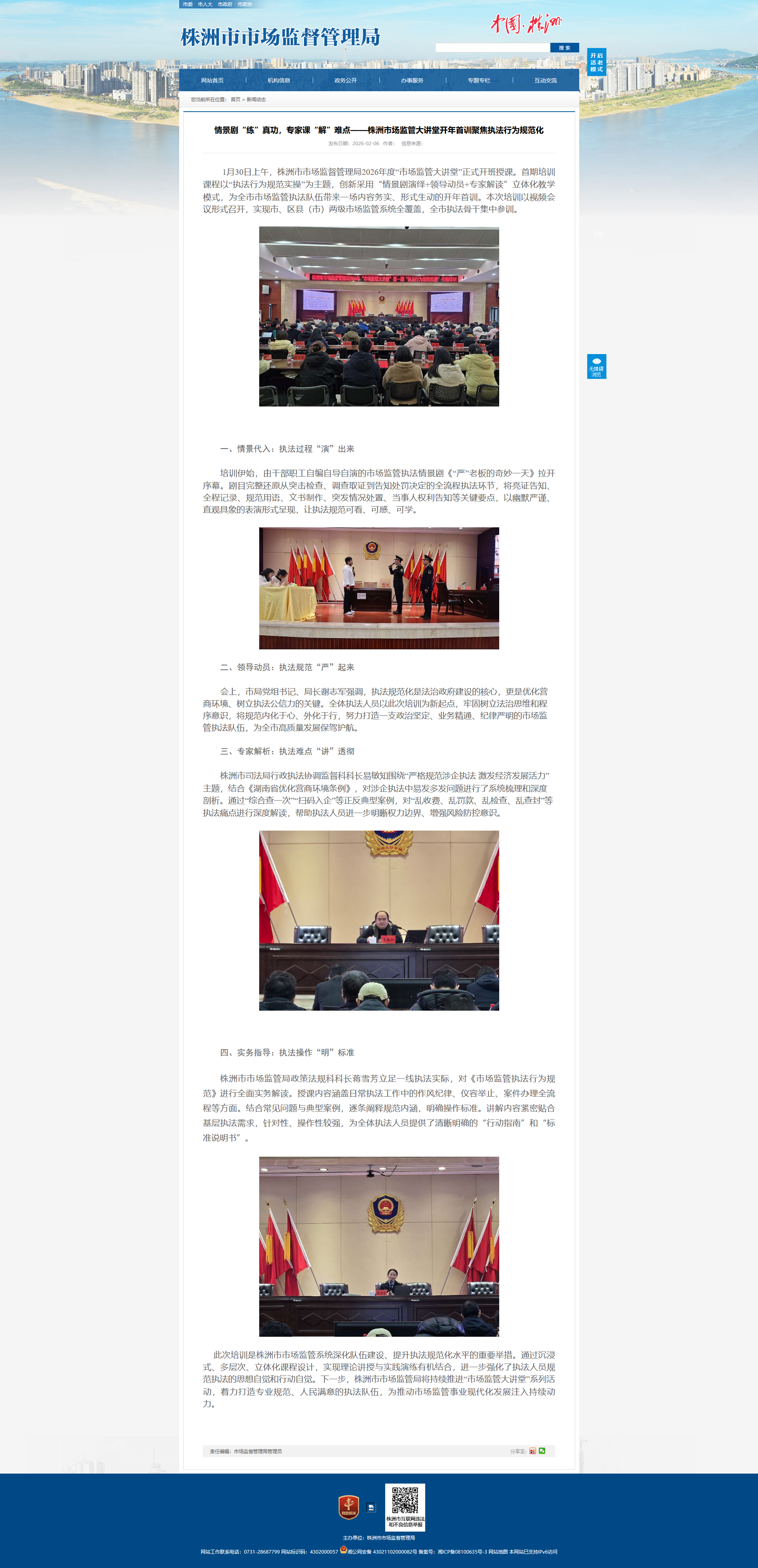 1月30日上午,株洲市市场监督管理局2026年度“市场监管大讲堂”正式开班授课。首期培训课程以“执法行为规范实操”为主题,创新采用“情景剧演绎 领导动员 专家解读”立体化教学模式,为全市市场监管执法队伍带来一场内容务实、形式生动的开年首训。本次培训以视频会议形式召开,实现市、区县(市)两级市场监管系统全覆盖,全市执法骨干集中参训。