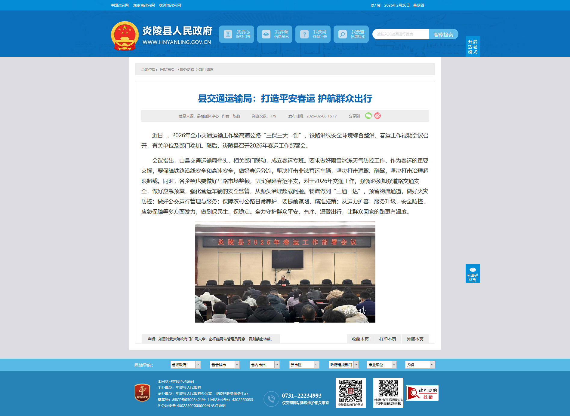 近日 ,2026年全市交通运输工作暨高速公路“三保三大一创”、铁路沿线安全环境综合整治、春运工作视频会议召开,有关单位及部门参加。随后,炎陵县召开2026年春运工作部署会。
