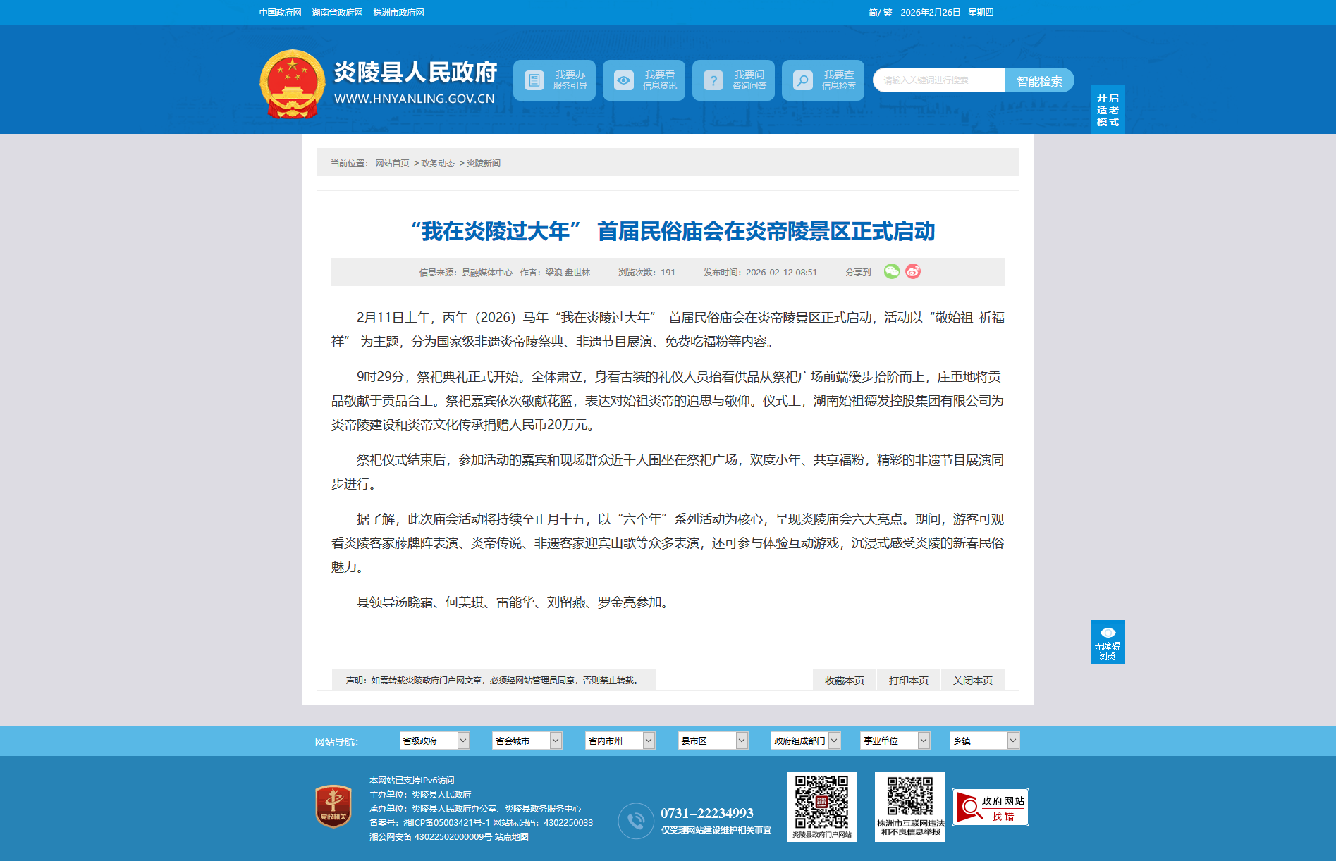 2月11日上午,丙午(2026)马年“我在炎陵过大年” 首届民俗庙会在炎帝陵景区正式启动,活动以“敬始祖 祈福祥” 为主题,分为国家级非遗炎帝陵祭典、非遗节目展演、免费吃福粉等内容。