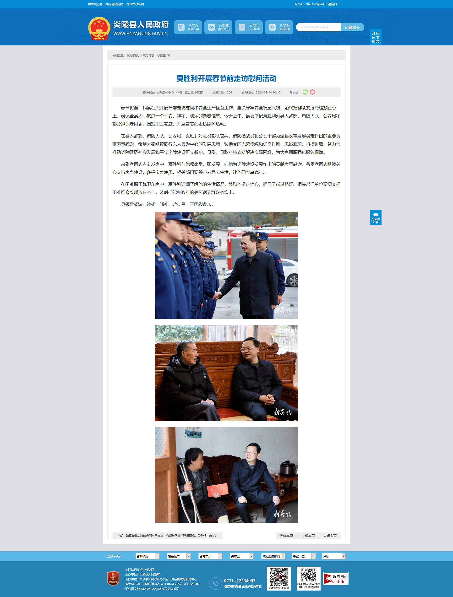 在县人武部、消防大队、公安局,夏胜利对驻炎部队官兵、消防指战员和公安干警为全县改革发展稳定作出的重要贡献表示感谢,希望大家继续践行以人民为中心的发展思想,弘扬党的光荣传统和优良作风,忠诚履职、拼搏进取,努力为推动炎陵经济社会发展和平安炎陵建设再立新功。县委、县政府将支持解决实际困难,为大家履职强化服务保障。
