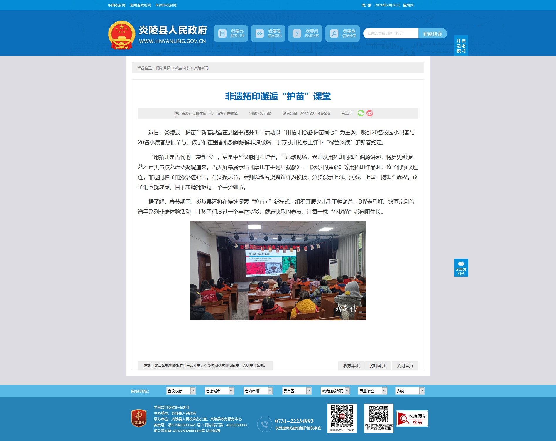 近日,炎陵县“护苗”新春课堂在县图书馆开讲。活动以“用拓印拾趣·护苗同心”为主题,吸引20名校园小记者与20名小读者热情参与。孩子们在墨香纸韵间触摸非遗脉络,于方寸用拓版上许下“绿色阅读”的新春约定。