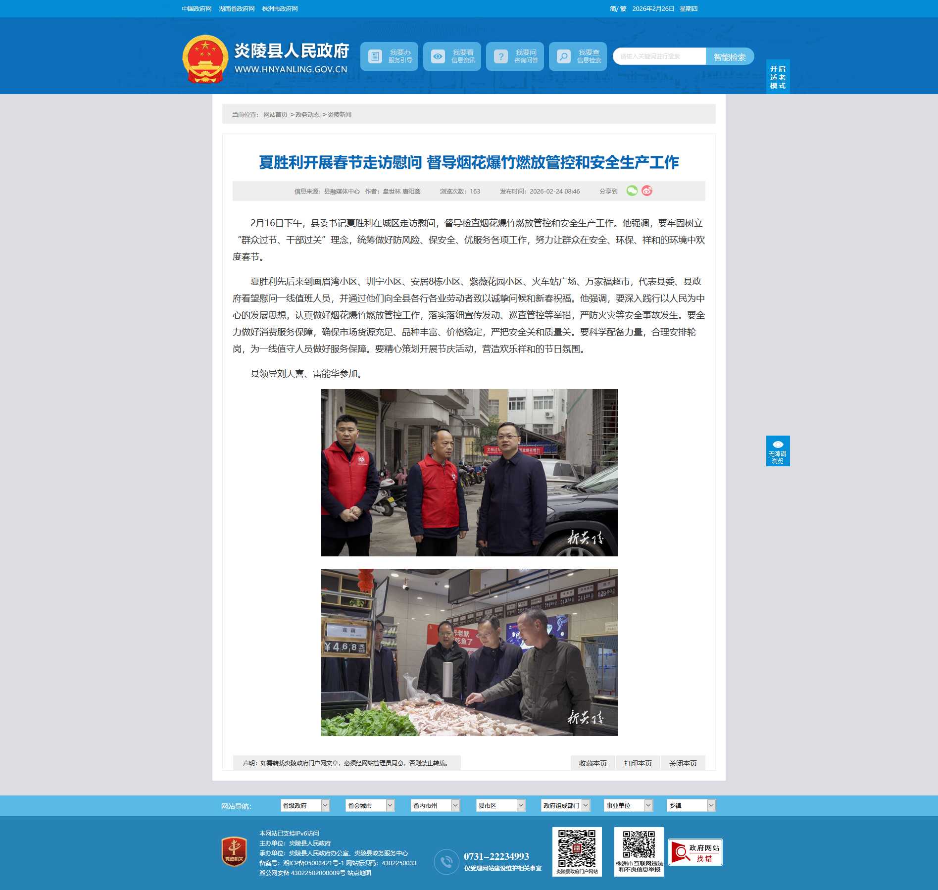 2月16日下午,县委书记夏胜利在城区走访慰问,督导检查烟花爆竹燃放管控和安全生产工作。他强调,要牢固树立“群众过节、干部过关”理念,统筹做好防风险、保安全、优服务各项工作,努力让群众在安全、环保、祥和的环境中欢度春节。