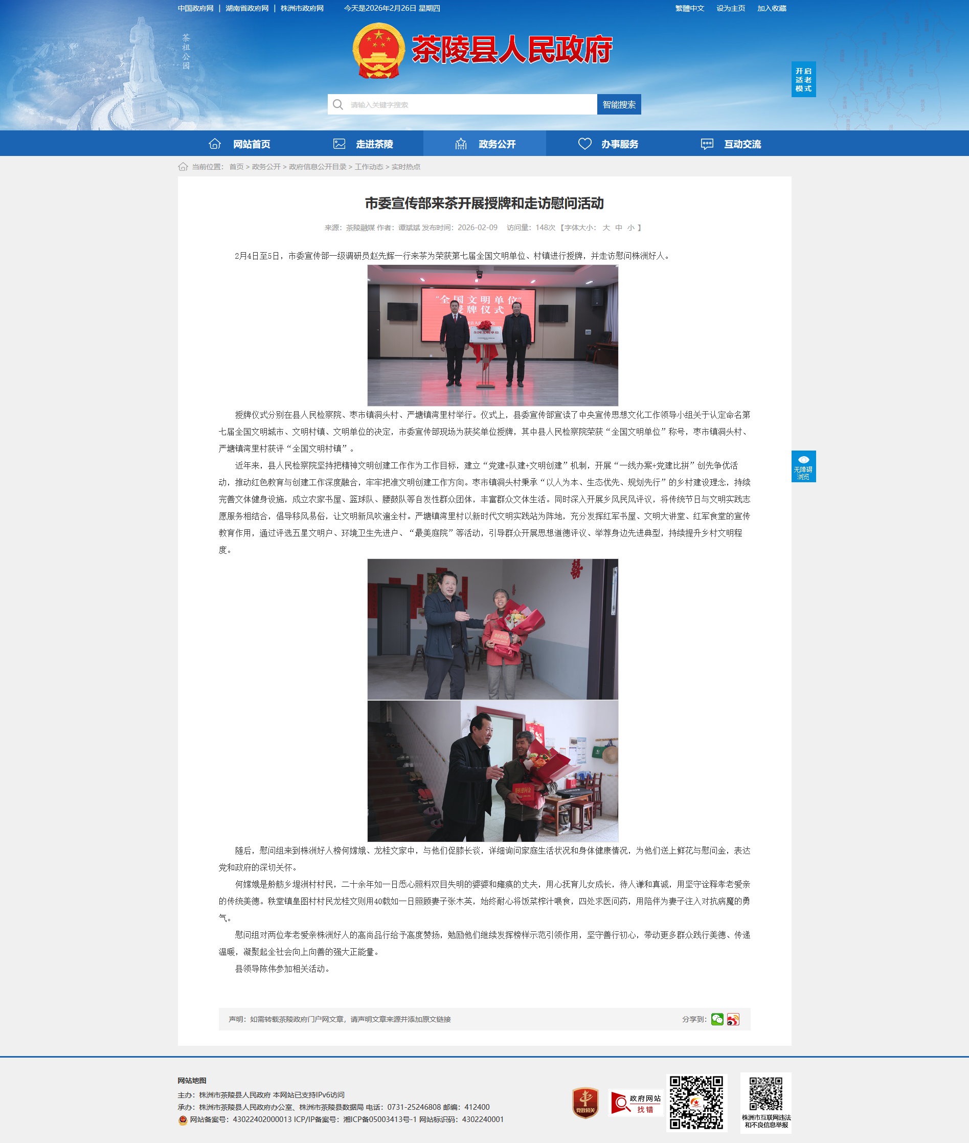 2月4日至5日,市委宣传部一级调研员赵先辉一行来茶为荣获第七届全国文明单位、村镇进行授牌,并走访慰问株洲好人。