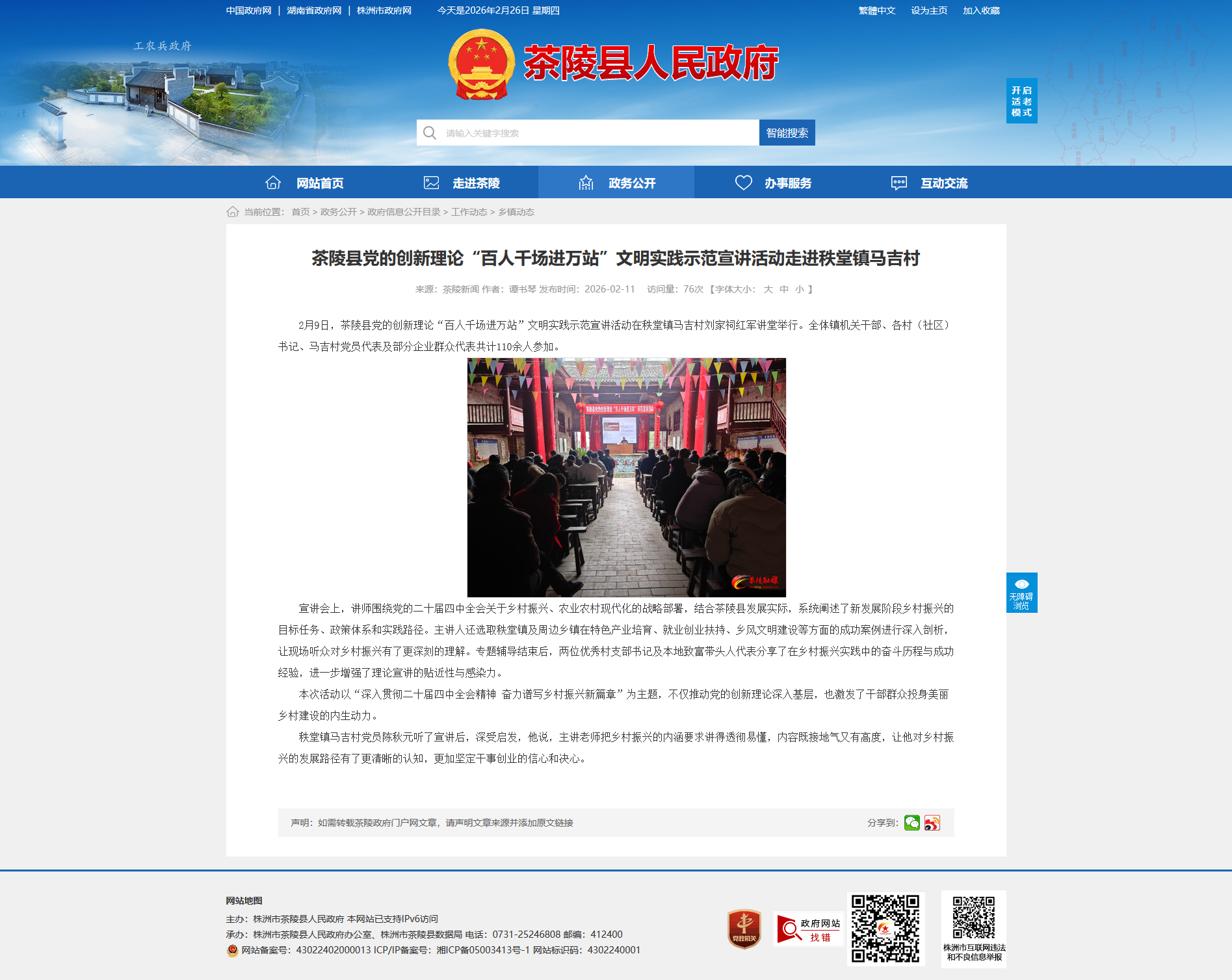 2月9日,茶陵县党的创新理论“百人千场进万站”文明实践示范宣讲活动在秩堂镇马吉村刘家祠红军讲堂举行。全体镇机关干部、各村(社区)书记、马吉村党员代表及部分企业群众代表共计110余人参加。