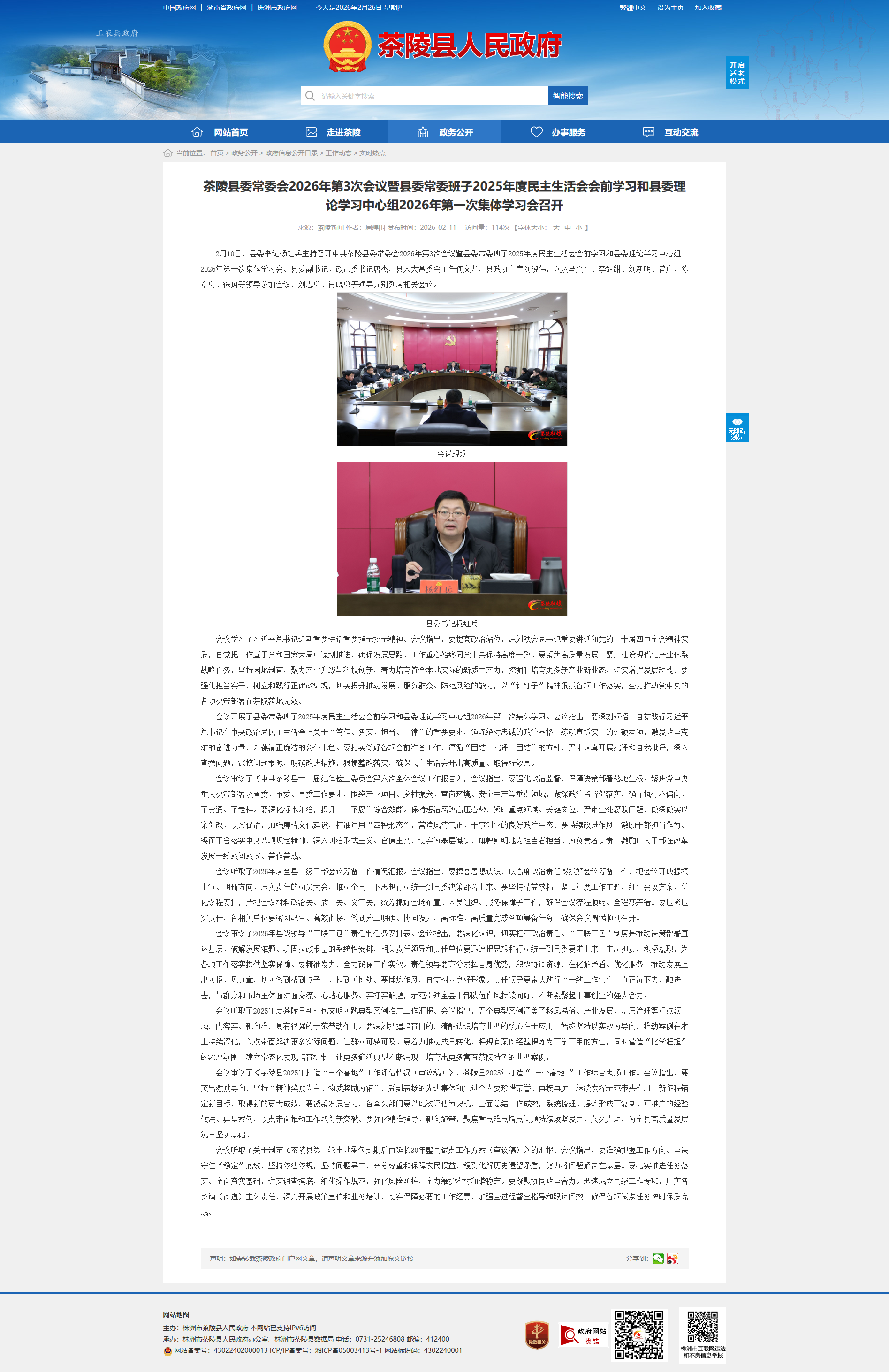 2月10日,县委书记杨红兵主持召开中共茶陵县委常委会2026年第3次会议暨县委常委班子2025年度民主生活会会前学习和县委理论学习中心组2026年第一次集体学习会。县委副书记、政法委书记唐杰,县人大常委会主任何文龙,县政协主席刘晓伟,以及马文平、李甜甜、刘新明、曾广、陈章勇、徐珂等领导参加会议,刘志勇、肖晓勇等领导分别列席相关会议。