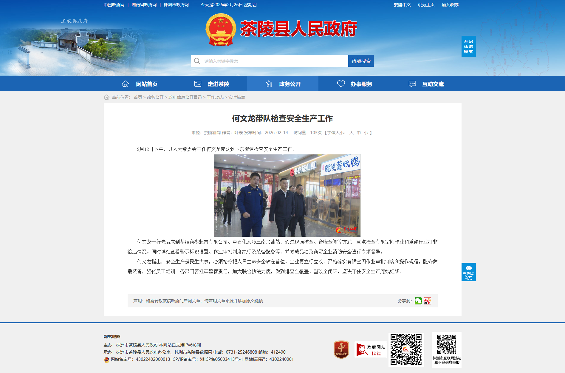 何文龙一行先后来到茶陵商洪超市有限公司、中石化茶陵三南加油站,通过现场核查、台账查阅等方式,重点检查有限空间作业和重点行业打非治违情况。同时详细查看警示标识设置、作业审批制度执行及装备配备等,并对成品油及商贸企业消防安全进行专项督导。