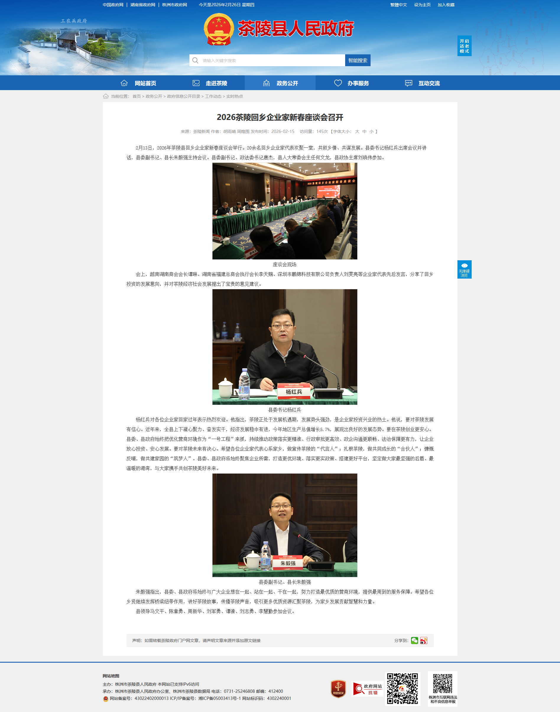 杨红兵对各位企业家回家过年表示热烈欢迎。他指出,茶陵正处于发展机遇期,发展势头强劲,是企业家投资兴业的热土。他说,要对茶陵发展有信心。近年来,全县上下凝心聚力、奋发实干,经济发展稳中有进,今年地区生产总值增长5.7%,展现出良好的发展态势。要在茶陵创业更安心。县委、县政府始终把优化营商环境作为“一号工程”来抓,持续推动政策落实更精准、行政审批更高效、政企沟通更顺畅、法治保障更有力,让企业放心投资、安心发展。要对茶陵未来有决心。希望各位企业家代表心系家乡,做宣传茶陵的“代言人”;扎根茶陵,做共同成长的“合伙人”;慷慨反哺,做共建家园的“筑梦人”。县委、县政府将始终聚焦企业所需,打造更优环境、落实更实政策、搭建更好平台,坚定做大家最坚强的后盾、最温暖的港湾,与大家携手共创茶陵美好未来。