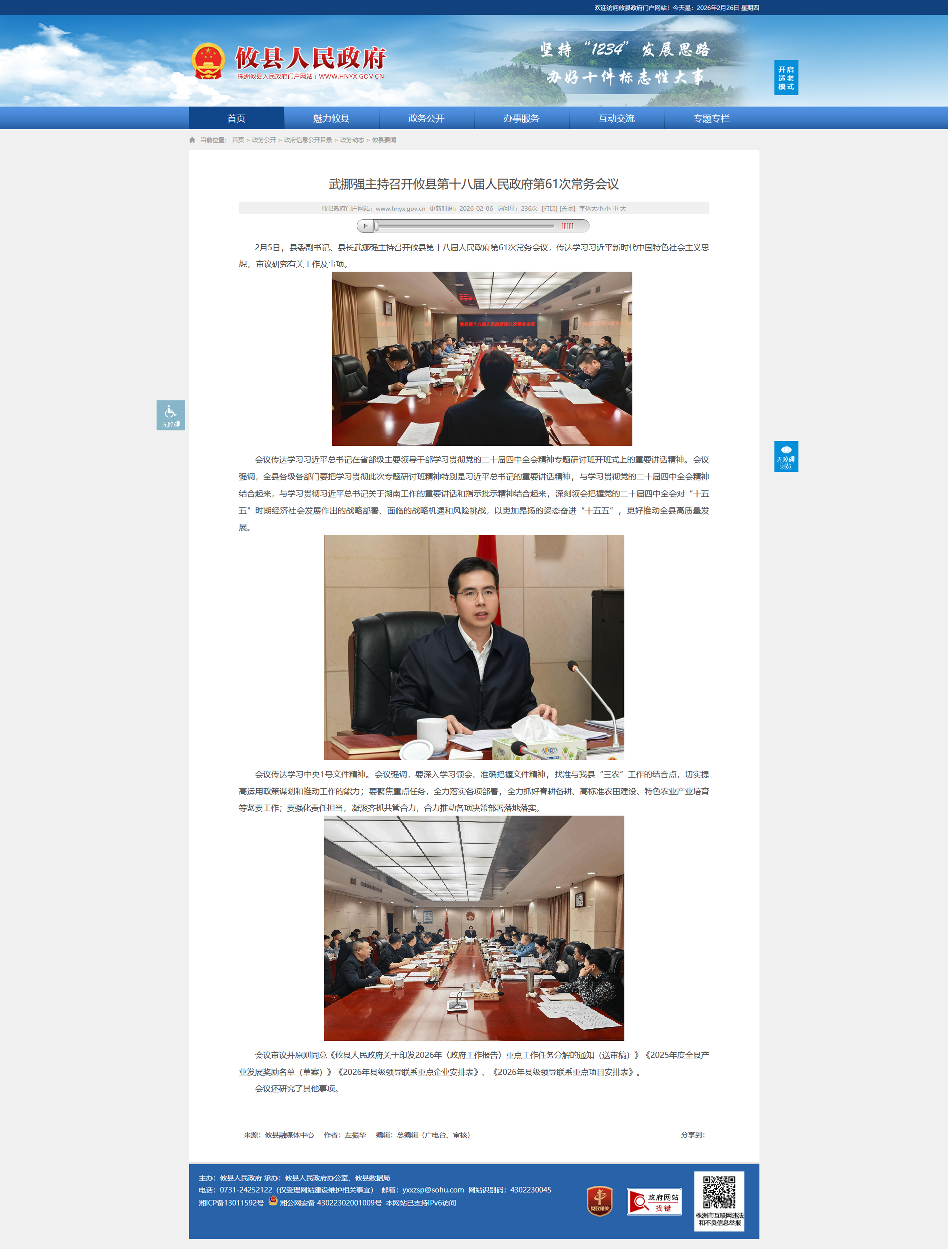 会议审议并原则同意《攸县人民政府关于印发2026年〈政府工作报告〉重点工作任务分解的通知(送审稿)》《2025年度全县产业发展奖励名单(草案)》《2026年县级领导联系重点企业安排表》、《2026年县级领导联系重点项目安排表》。