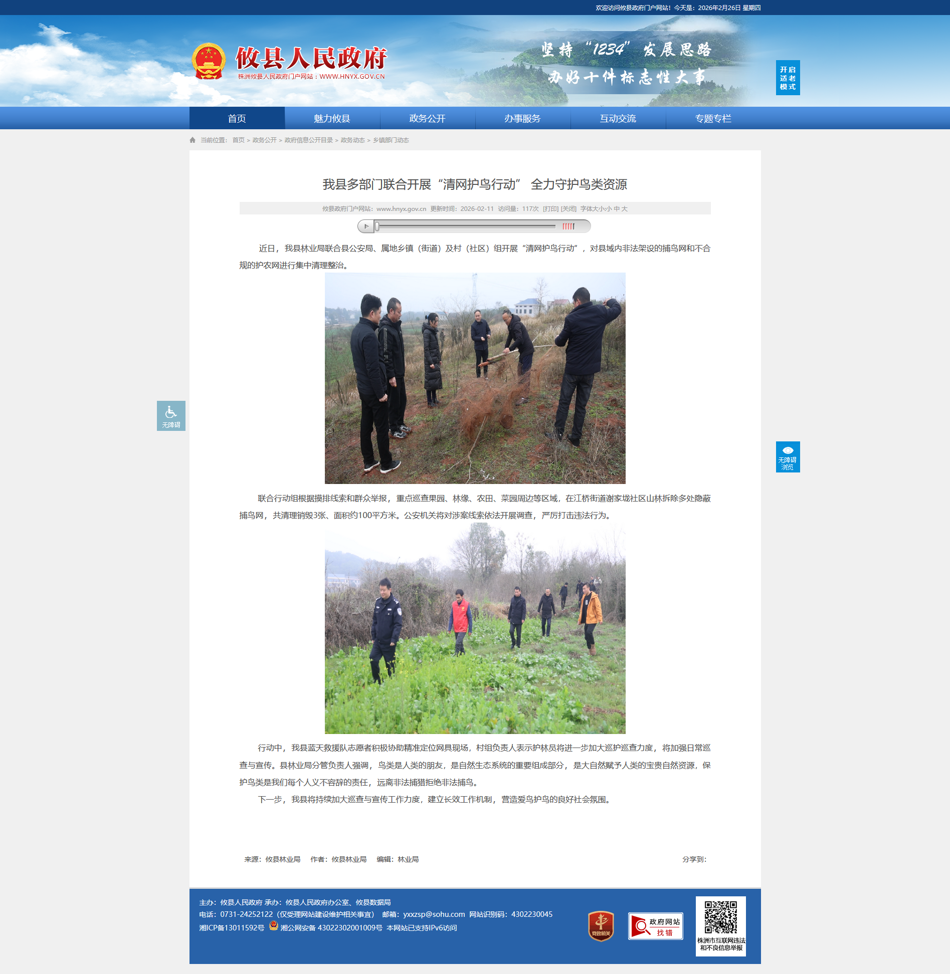 近日,我县林业局联合县公安局、属地乡镇(街道)及村(社区)组开展“清网护鸟行动”,对县域内非法架设的捕鸟网和不合规的护农网进行集中清理整治。