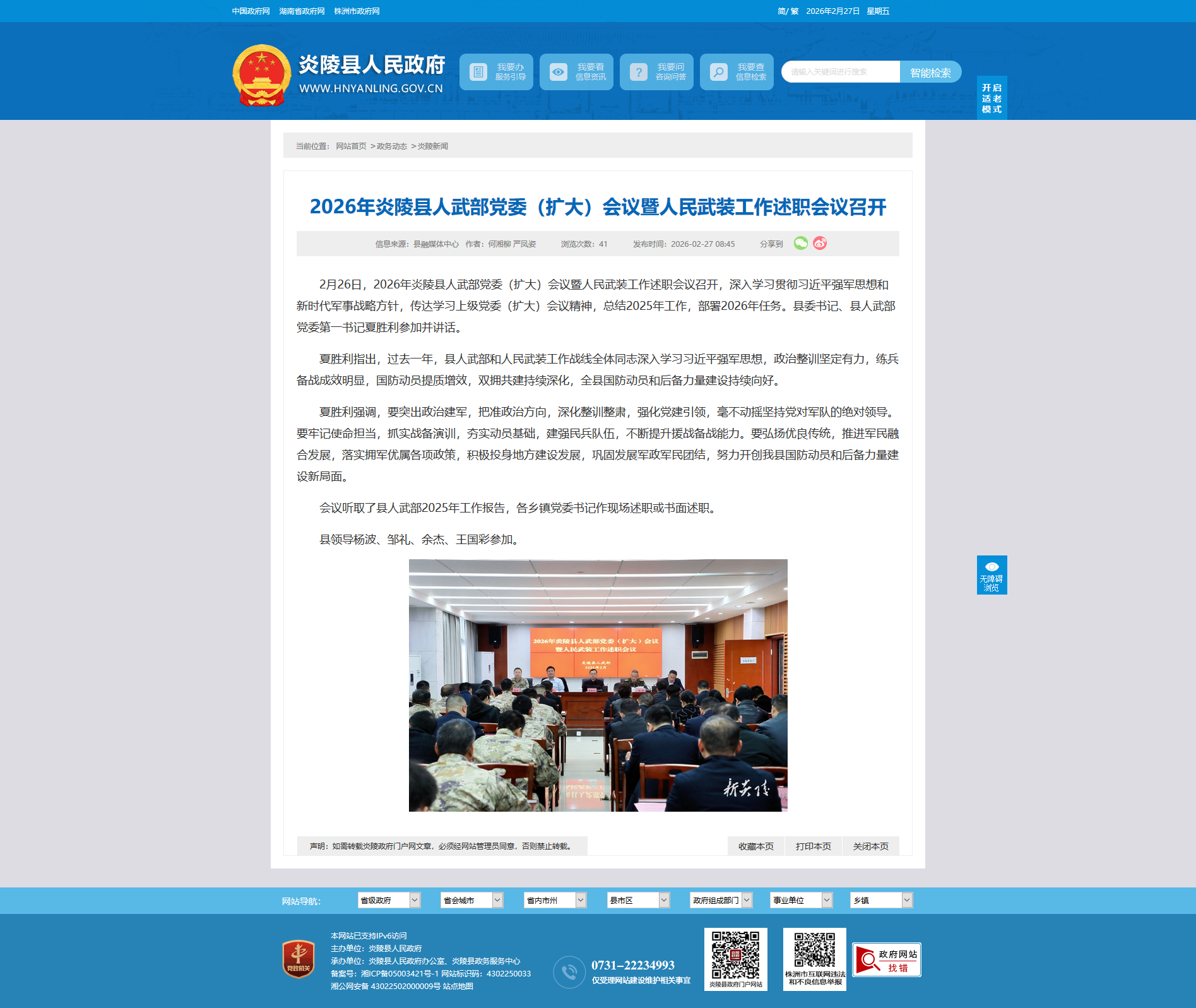 2月26日,2026年炎陵县人武部党委(扩大)会议暨人民武装工作述职会议召开,深入学习贯彻习近平强军思想和新时代军事战略方针,传达学习上级党委(扩大)会议精神,总结2025年工作,部署2026年任务。县委书记、县人武部党委第一书记夏胜利参加并讲话。