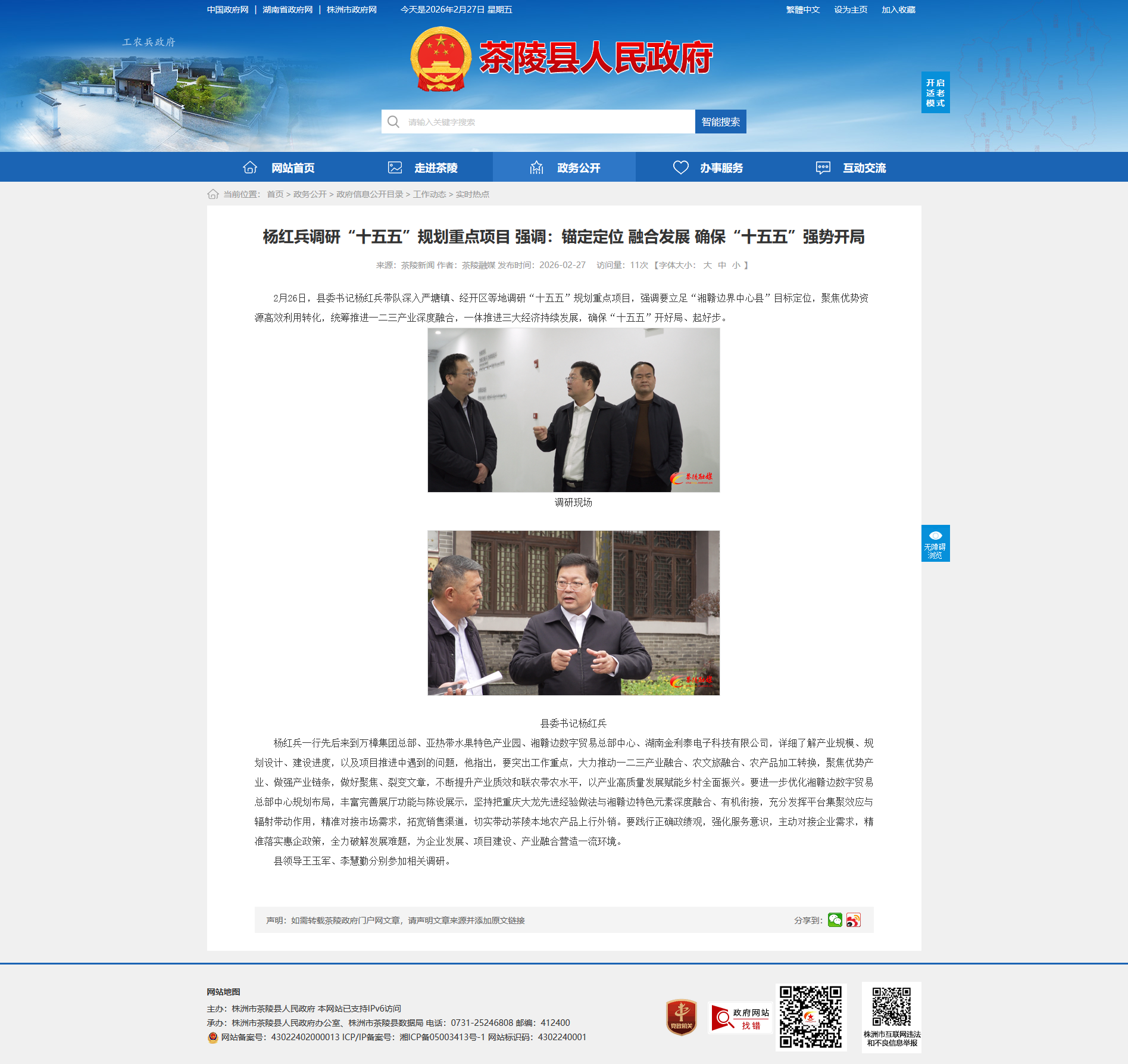 2月26日,县委书记杨红兵带队深入严塘镇、经开区等地调研“十五五”规划重点项目,强调要立足“湘赣边界中心县”目标定位,聚焦优势资源高效利用转化,统筹推进一二三产业深度融合,一体推进三大经济持续发展,确保“十五五”开好局、起好步。